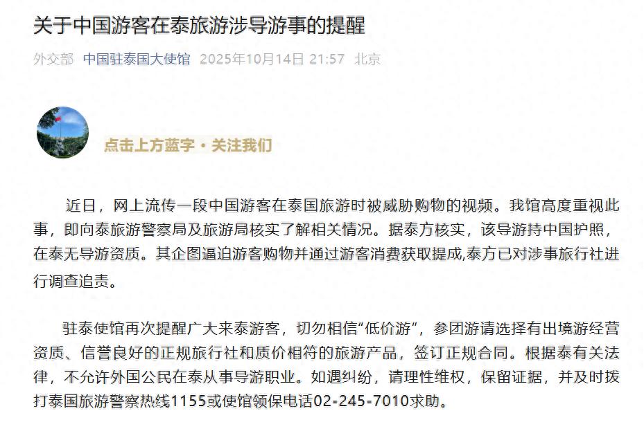 10月14日晚,中国驻泰国大使馆发布《关于中国游客在泰旅游涉导游事的提醒》:近日,网上流传一段中国游客在泰国旅游时被威胁购物的视频。我馆高度重视此事,即向泰旅游警察局及旅游局核实了解相关情况。据泰方核实,该导游持中国护照,在泰无导游资质。其企图逼迫游客购物并通过游客消费获取提成,泰方已对涉事旅行社进行调查追责。 驻泰使馆再次提醒广大来泰游客,切勿相信“低价游”,参团游请选择有出境游经营资质、信誉良好的正规旅行社和质价相符的旅游产品,签订正规合同。根据泰有关法律,不允许外国公民在泰从事导游职业。如遇纠纷,请理性维权,保留证据,并及时拨打泰国旅游警察热线1155或使馆领保电话02-245-7010求助。  此前报道:在泰国威胁中国游客的黑导游已被逮捕,系中国籍公民,长期在泰国非法执业,7年前曾因强迫购物在泰国被捕 据三湘都市报,10月13日,有网友发布视频称在泰国旅游时,遭遇强制消费,导游态度嚣张,用中文威胁游客“不消费就让你回不了中国”“到了免税店让你上不了车”等,还手指拍摄者要求“把视频给我删了”。 事件曝光后,泰国国家旅游局表示将严肃处理涉事导游和旅行社。泰国旅游警察第一局代理局长颂差亲自带队调查。 目前,涉事导游已被泰国警方逮捕,他承认因游客购物太少无法获得回扣而恐吓游客。此外,涉事旅行社的两名负责人也因非法从事导游行业工作被捕,面临最高2年监禁和50万泰铢(约10万元人民币)的罚款。 据介绍,该名导游叫李海,是中国籍公民,无合法导游证,长期在泰国非法执业。他被曝通过低价旅行团吸引游客,行程中频繁安排购物点并收取回扣,还曾对不消费游客采取言语威胁、限制人身自由等手段。 2018年,李海也曾因辱骂游客、强迫购买乳胶枕被泰国警方逮捕,涉事旅行社的泰籍负责人同时被拘。 来源:中国驻泰国大使馆、此前报道 (来源:中国驻泰国大使馆、此前报道)