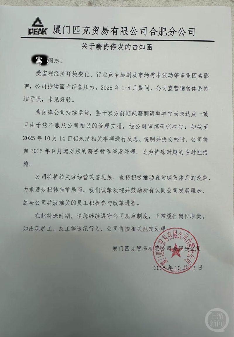近日,知名运动品牌匹克因未通知员工便实施全员阶梯式降薪,最高降幅达到50%,引发社会关注。10月13日,这场“降薪”风波出现新进展。有匹克员工透露,公司向拒绝降薪的员工发出“最后通牒”,要求其在10月14日前提交“反思检讨”,否则将面临停发9月份工资的处罚。 对于“不写检讨就停薪”的要求,泉州市丰泽区劳动保障维权中心工作人员明确回应,此行为属违法。若情况属实,建议员工投诉并申请劳动仲裁。 网传匹克公司发送给员工的通知显示:“为保障公司持续运营,鉴于双方前期就薪酬调整事宜未达成一致且由于您不服从公司相关的管理安排,如截止到10月14日仍未就相关事项进行反思、说明并提交检讨,公司将自2025年9月起对薪资暂做停发处理。”  网传通知。网络图 匹克某分公司员工汪先生(化名)证实,这并非谣言,《关于薪资停发的告知函》确实存在,且“全公司上下都是这个要求”。他表示,员工们对企业“未协商先降薪”的做法本就十分反感,此次“检讨+停薪”的要求更引发强烈抵触情绪。“我不会写,据我所知,我身边的同事也没人写——我们只是反对不合理的降薪,怎么就成了‘不服从管理’?”汪先生还提到,匹克员工的薪资在行业内本就不占优势,最高50%的降薪幅度远超大家的承受能力。  汪先生收到的公司“不写检讨就停薪”通知。受访者供图 多名匹克员工也向记者反映,公司早前告诉员工有意见就要提,提了又说员工不服从管理,“早前,大家对于降薪基本都是反对意见,但反对的人都要写检讨,不写就停薪,这不合理。” 丰泽区劳动保障维权中心工作人员指出:“未经员工同意的降薪,本身就违反了《劳动合同法》;如果‘不写检讨就停薪’属实,同样是违法行为。”该工作人员透露,他们昨天就降薪问题已联系过匹克集团一位张姓领导层,对方称自己同样被降薪50%,且无法联系到上级领导,“大领导的电话直接被转入了语音信箱,我也无力解决相关问题。”目前,当地劳动保障部门已就匹克员工反映的问题立案,并为投诉员工申请了劳动仲裁。  网传匹克通知。网络图 10月14日,就“拒降薪需写检讨否则停薪”一事,记者致电匹克总部人事部门。对方一听采访主题,未作出任何回应便挂断了电话。 同日,泉州市人力资源和社会保障局向记者表示,此前已收到过相关反映,并指出写检讨属于企业内部管理行为,人社局无法直接判断其合法性,“但如果企业以此为由克扣员工薪资,那肯定是违法的,我们会进一步核实情况。”对方称,由于匹克是丰泽区重点企业,相关维权事宜已交由丰泽区劳动保障维权中心统筹处理,人社局将持续关注事件进展。 上游新闻记者 周荞 |