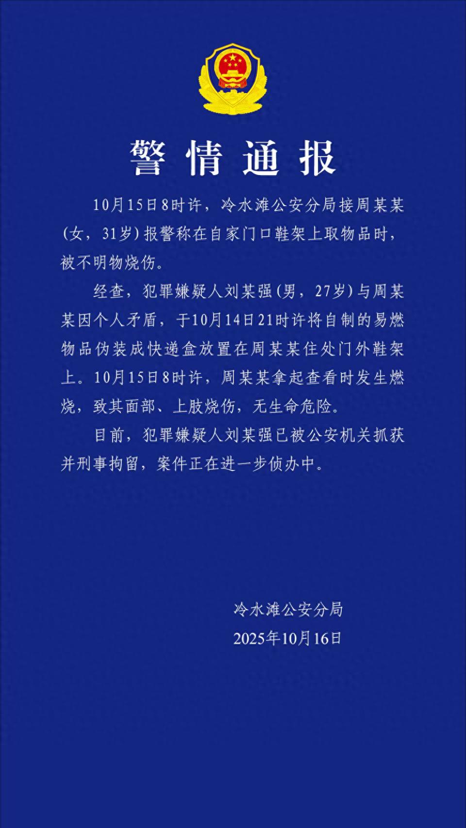 10月16日,冷水滩公安分局发布警情通报: 10月15日8时许,冷水滩公安分局接周某某(女,31岁)报警称在自家门口鞋架上取物品时,被不明物烧伤。 经查,犯罪嫌疑人刘某强(男,27岁)与周某某因个人矛盾,于10月14日21时许将自制的易燃物品伪装成快递盒放置在周某某住处门外鞋架上。10月15日8时许,周某某拿起查看时发生燃烧,致其面部、上肢烧伤,无生命危险。 目前,犯罪嫌疑人刘某强已被公安机关抓获并刑事拘留,案件正在进一步侦办中。