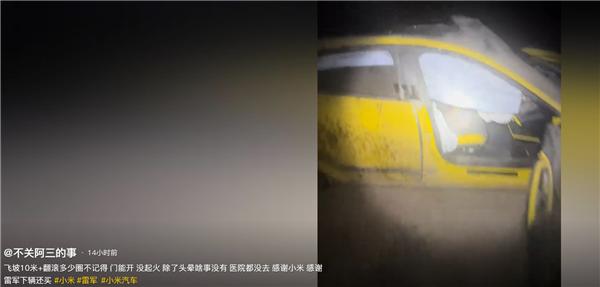 近日,新疆乌鲁木齐一位小米SU7 Ultra车主经历了惊魂一幕——车辆从10多米坡上滚下来,翻滚了不知道多少圈,自己万幸没有受伤。  “飞坡10米+,翻滚多少圈不记得 ,门能开,没起火,除了头晕啥事没有,医院都没去,感谢小米,感谢雷军,下辆还买”,该车主发视频说道。   视频中,这辆黄色的小米SU7 Ultra车内气囊全爆,车顶玻璃天幕碎裂,车轮撞掉,车身损坏严重,但AB柱完好,车门也能正常打开,并未发生起火。  在另外一段视频中,车主坐在主驾驶,与报废的车辆合影。  在评论中,该车主透露,车辆定损60万,已经走了全损。 从他早些时候发布的视频得知,这辆车于今年3月9日交付,是新疆交付的第一台小米SU7 Ultra。  来源:南昌晚报综合