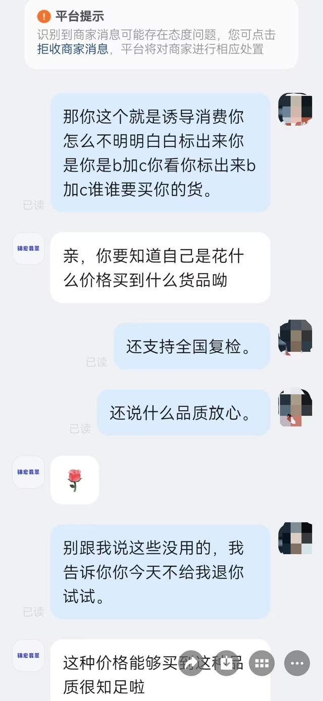 消费投诉—— 直播间下单翡翠手镯,退货后遭强制发货 9月22日,福建的程女士向华商报大风新闻反映,9月15日凌晨1时21分,她在抖音刷翡翠手镯直播,在店铺“锦宏翡翠”的直播间“锦宏奢品手镯工厂店”,花费1088元拍下了“时尚缅风美人翠饰品手镯【直播专用链接】”。“直播间里主播说缅甸翡翠‘保真的’,下单后我咨询客服,了解翡翠的具体情况,询问手镯有没有清晰图片?有没有证书?是否为染色注胶?商家只说放心品质,支持复检。我多次询问能不能七天无理由退货,客服一直不正面回答,只说让我先收回去看看。”程女士说,整个沟通过程让她实在不放心,凌晨1时55分,她申请退货。 “退货后我又刷别的直播间,抖音又把这家直播间推给我了,进去时我还问是不是刚那家,主播骗我是新的直播间。凌晨2点40分,我又下单了一个1688元的翡翠镯子。”程女士说,付款后她联系客服,发现确实是同一家,凌晨2时41分赶紧申请退款。  凌晨3点,客服询问客户是否安排加工 受访者供图