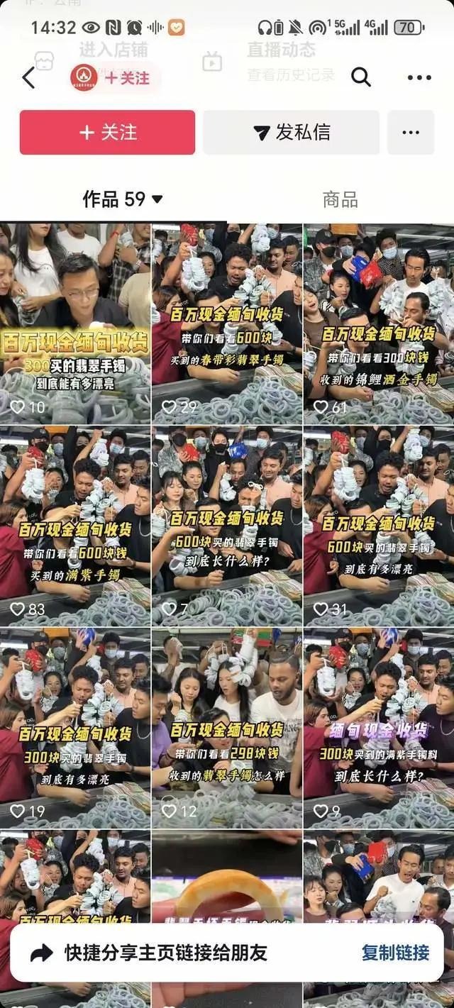 剧本演绎—— 宣传源头缅甸现场收的翡翠,IP却为国内 部分翡翠直播间强调缅甸“源头”,宣称“源头”直播间售卖的产品比国内产品价格低、品质高。直播间内还会上演主播与说着所谓缅语的供货商砍价的剧情,以虚假突出所谓“高品质”与“高性价比”。  缅玉翡翠定制店发布大量视频,每条封面都是人山人海拥抢翡翠手镯