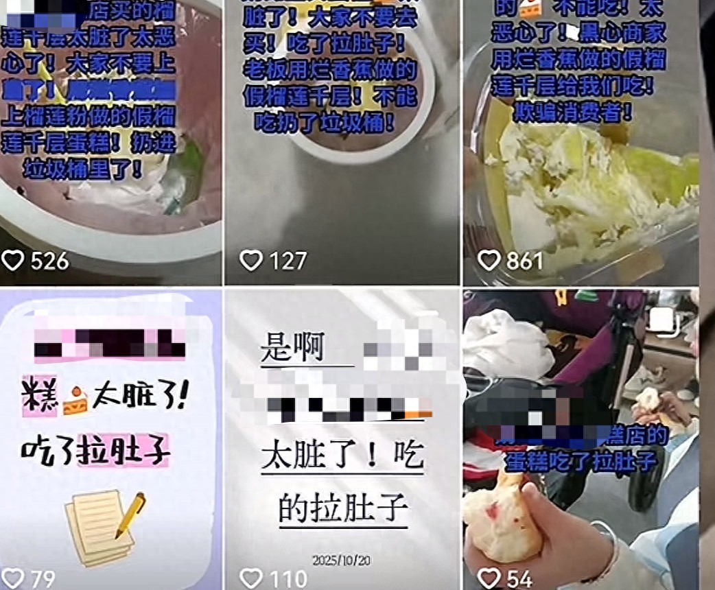 10月20日,景德镇有网友发布贴文称,当地一蛋糕店“太脏了”“吃了拉肚子”“用烂香蕉做假榴莲千层”。次日,蛋糕店负责人发布了店内的监控录像证明其“清白”。 华商报大风新闻记者在视频中看到,10月20日13时45分许,一女子带着孩子进入蛋糕店,孩子将手伸入橱窗试图触摸未经包装的蛋糕,店家出言提醒:“手不能拿,你要就给我嘛,我给你装,手不能碰的哈。”之后该女子对孩子怒斥:“要什么啊?烦死了,以后不来了。”该女子离开蛋糕后约5分钟后,连发多条贴文称孩子吃坏了肚子,让网友“避雷”。