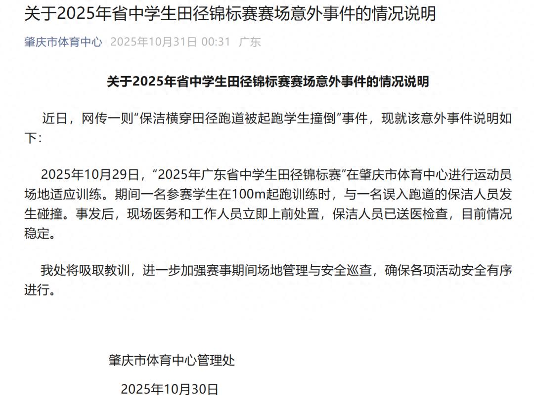 10月30日,肇庆市体育中心管理处发布《关于2025年省中学生田径锦标赛赛场意外事件的情况说明》。 近日,网传一则“保洁横穿田径跑道被起跑学生撞倒”事件,现就该意外事件说明如下: 2025年10月29日,“2025年广东省中学生田径锦标赛”在肇庆市体育中心进行运动员场地适应训练。期间一名参赛学生在100m起跑训练时,与一名误入跑道的保洁人员发生碰撞。事发后,现场医务和工作人员立即上前处置,保洁人员已送医检查,目前情况稳定。 我处将吸取教训,进一步加强赛事期间场地管理与安全巡查,确保各项活动安全有序进行。