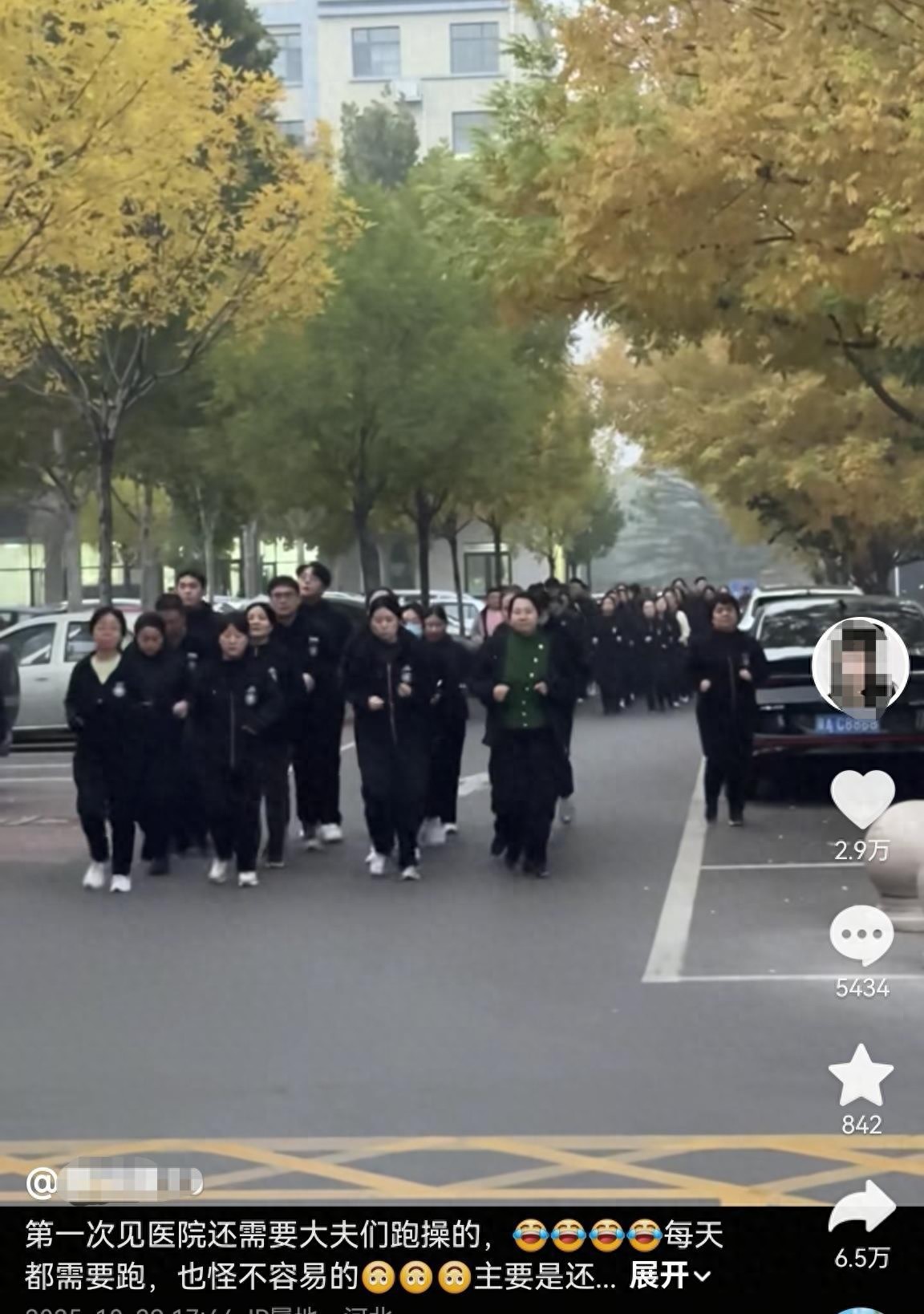 近日,有网友发视频称,河北石家庄一家医院组织员工跑操。“第一次见到医院还需要大夫跑操的……也怪不容易的……五圈呢!国际庄就是不一样!”  来源:网友拍摄视频截图 视频显示,在石家庄市西部中心医院门诊大楼前的广场上,有许多身穿便服的人集合起来,在院内的道路上开始跑步。对此,有网友提出,医护人员本身比较辛苦,可以个人灵活安排锻炼时间,这样集体折腾不合适。也有网友担心医护人员跑步去了,会不会影响工作。  来源:网友拍摄视频截图 博主发文回应称,她是去买药的时候,发现这个医院的大夫需要跑步,她从来没见过,就发出来让大家也看看,当个新鲜事,没必要上纲上线,跑步之前会喊话,内容大概就是,强身健体,保证自己有好身体的前提下,才能够保障老百姓的身体健康。 另外,视频发布者还转发了本院医护人员的回复称,大概是从二零年开始跑的,每周一至周五下午五点半跑五圈,大概两公里,除病房值班的医生护士和手术室里正在进行的手术外,行政后勤及医护人员都要跑步,每次跑前唱三大纪律八项注意,跑前查人数点名,跑不了的开假条,他们还有走步方队,跑完出一身汗,确实挺轻松的,跑的时候还会放音乐,其实每年他们新入职的医护还会组织军训,跑步算个传统。 来源:网友拍摄视频截图 极目新闻记者注意到,早在2022年9月,就有该医院的医护人员发布了跑步的视频说:内科方队跑步,每天下午必修课。 “咱们医院有跑步的文化。”10月31日上午,该院一名工作人员介绍,跑步都是在下午下班之后,在院区里跑,具体人数和跑步公里数不清楚。另一名工作人员介绍,跑步是为了把医护人员的身体锻炼得更好,可以更好地照顾病人,值班的医护人员留下,其余的能跑的都可以参加,还鼓励病人也参加,当然也会保证患者的安全。 据石家庄卫健委官网消息,石家庄市西部中心医院(井陉县医院)是一所三级综合性医院。医院是“院士工作站”“国家上消化道癌早诊早治项目示范基地”,入选了全国首批“千县工程”示范单位,也是2022年省级现代医院管理制度建设样板医院、公立医院高质量发展省级试点医院,曾受到国家、省市卫健委等上级领导的赞扬和肯定。