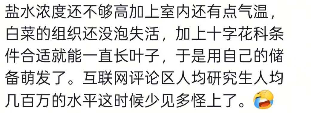 视频显示,陈先生家的酸菜缸中一颗腌制的酸菜长出了新叶子,对此有不少网友感到好奇,也有网友表示无土盐水栽培,卖给农学生吧,不过另有网友称这种情况是盐度不够加上室内还有气温所致。