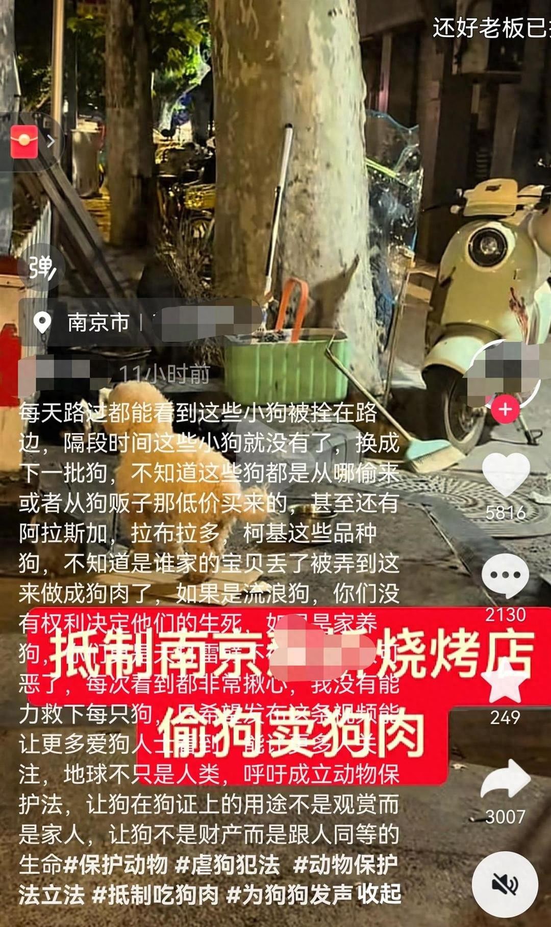 网友发布的视频截图 3日晚,南京一位网友发布视频时配文写道:“每天路过都能看到这些小狗被拴在路边,隔段时间这些小狗就没有了,换成下一批狗,不知道这些狗是从哪偷来或者从狗贩子低价买来的,甚至还有阿拉斯加、拉布拉多、柯基这些品种狗,不知道是谁家的宝贝丢了被弄到这来做成狗肉了……我没有能力救下每只狗,只希望发布这条视频能让更多爱狗人士看到……”其发布的视频中,仅是一家烧烤店前有两只宠物狗,其中一只窝在地上。“抵制南京某烧烤店偷狗卖狗肉。”该网友还在视频中标注了这几个红色大字,并将烧烤店在第三方平台的具体信息截图附在视频中。 极目新闻记者注意到,该视频仅发布11个小时,就已获超5000次点赞,超3000次转发。有网友认为视频中并没有烧烤店偷狗卖狗肉的证据,也有网友表示要向当地投诉,让这家店关店,甚至有网友煽动其他人到第三方平台去给这家店写差评。 4日上午,该店老板孙先生告诉极目新闻记者,视频中被拴在烧烤店门口的狗是他养的宠物狗,因烧烤店晚上营业,他和妻子便将宠物狗带到店里。 “我们工作时间比较长,也不能一直把狗关在家里,这不现实,得带它们出来。”孙先生的妻子说,3日晚,朋友提醒她有网友在社交平台发布了上述视频,还有网友特意打电话询问是否卖狗肉,“昨晚上一有客人来,我就笑着问他是来吃狗肉的吗?客人反问我什么意思,我说我们家被网暴了你不知道吗。” 孙先生称,他家是做牛羊养殖的,有养殖场地,家里人喜欢狗,因此家里养了十多只宠物狗,品种丰富,“宠物狗很贵的,一只宠物狗三四斤,比牛羊肉还贵,怎么可能卖狗肉呢?” 视频发布后,孙先生接到了数十个陌生电话,“有人直接说你卖狗肉,我要抓你,我要让你关店。”此外,在第三方平台,孙先生的店也被网友留下不少差评:“昧着良心赚黑心钱”“垃圾店倒闭吧”等。 “已经报警了,警察建议我们起诉视频发布者,我们肯定会起诉这位网友的。”孙先生说。 该烧烤店附近的一家商户称,她经常看到这家烧烤店门前有宠物狗,“这是他们家自己养的宠物狗,怎么会虐狗呢?他们很喜欢狗。” 辖区警方表示,该烧烤店老板确实报过警,工作人员到过现场,但具体情况不便透露。 极目新闻记者注意到,4日上午,发布上述视频的网友已经将相关视频删除。 来源:极目新闻
