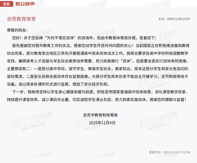 11月4日,自贡市教育和体育局回应: 当前国家正在积极推进基础教育综合改革,部分教育发达地区已率先开展普通高中周末双休试点工作。我局也要求各高中学校积极调整教学安排,兼顾高考人才选拔与学生综合素质培养需要,努力探索推行“双休”。但是要全面实行双休有所困难,主要原因有二:一是部分高中学校,留守学生、寄宿学生较多,离家较远,周末这部分学生和家长有迫切的留校需求。二是家长反映全面双休存在监管困难,大部分学生周末在家不能自主开展学习,无节制使用电子设备。或以周末补课的形式进行监管,增加了家长经济负担。 下一步,我局将坚持以学生身心健康发展为前提,积极宣传国家普通高中双休政策,深化课堂教学改革、持续提升课堂效率、减少课后作业量、切实减轻学生课业负担,努力探索实施双休。感谢您的理解与监督!