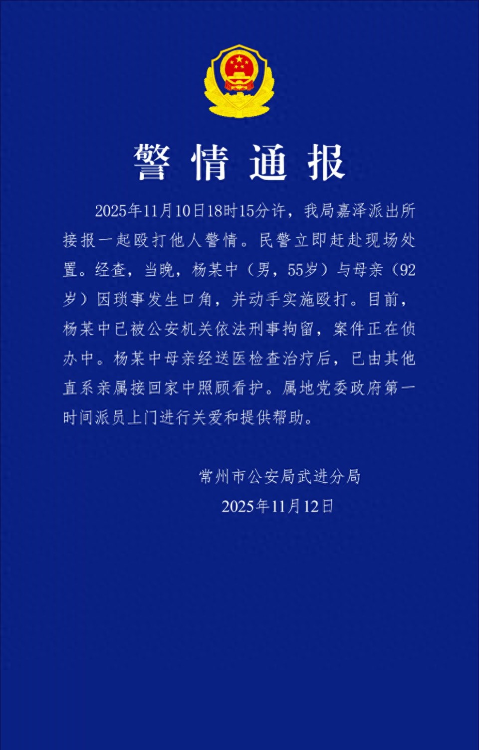 近日,江苏常州“男子殴打92岁母亲”的视频引发网络关注。11月12日,江苏常州警方发布警情通报:  此前,一段“儿子殴打92岁母亲”的视频在网上流传。视频显示,一名男子先是对着一名白发老太太厉声质问,然后连续扇耳光,老人发出大声哀嚎。此后老人跑到厨房,男子跟过去拉住其头发,将她摁在地上殴打。视频引发大量关注,许多网友对男子的行为表示谴责。 据悉,打人男子杨某中与母亲住在常州武进区嘉泽镇厚余观后村。邻居透露,杨家母子是隔壁村人,大约3年前拆迁后搬到该村。老人的老伴20多年前就已去世,她生了四个女儿后才生了杨某中这一个儿子,“宠得不得了,他要什么就给什么。家里几个姐姐如今均已超过60岁,之前也总会给弟弟买这买那的。杨某中从小给老妈惯坏了脾气,就是个爆炸罐。” 杨某中曾经结婚三次,婚姻不算顺利。“第一个老婆生了儿子,过了几年离婚走了;第二个老婆也生了个儿子,是个残疾人,后来得癌症死了;后来又娶了现在第三个老婆,生了第三个儿子。”此前,在镇上一家服装厂做裁缝,但近几年生意不好,杨某中也不再上班了,家里经济条件一直不好。“三个孙子基本都是老太太带大的,这个老太太也坚强。”如今,除了第三个儿子在念书,前两个儿子均已工作。杨某中的妻子在超市工作。 老人身体一向比较硬朗,也不是一直由杨某中赡养,更多时候是住在杨某中姐姐家。“几个女儿身体也不好,身体吃不消时,就送老人到弟弟(杨某中)那里。”  杨某中殴打母亲的视频截图 邻居推测,杨某中打母亲的原因可能是“脾气不好”,加上老人有老年痴呆,生活中有些小错误,杨某中就突然发怒了。  观后村事发的房屋,为杨某中租住 尽管这次被儿子打了,但老人并未计较,从医院检查回来,得知儿子被警方抓捕后,老人“说儿子没打到腿。拿了500块钱,叫了一部车,说要到派出所,把儿子‘赎’出来。还担心儿子,说他有糖尿病,瘦得不得了(怕他承受不住)”。 邻居称,杨某中在观后村租的房子,房东原本就装了监控。“二孙子发现了视频,心疼奶奶,打电话告诉了姑姑。杨某中的姐姐就来调了监控,不知怎么就传出去了。” 有网友推测“杨某中酒后打人”,对此,杨某中表哥表示,杨某中不喝酒。表哥从小和杨某中一起长大,杨某中“良心不坏”,但确实从小被溺爱。“他也是有情绪的。” 来源:澎湃新闻、红星新闻、大河报、羊城晚报 |