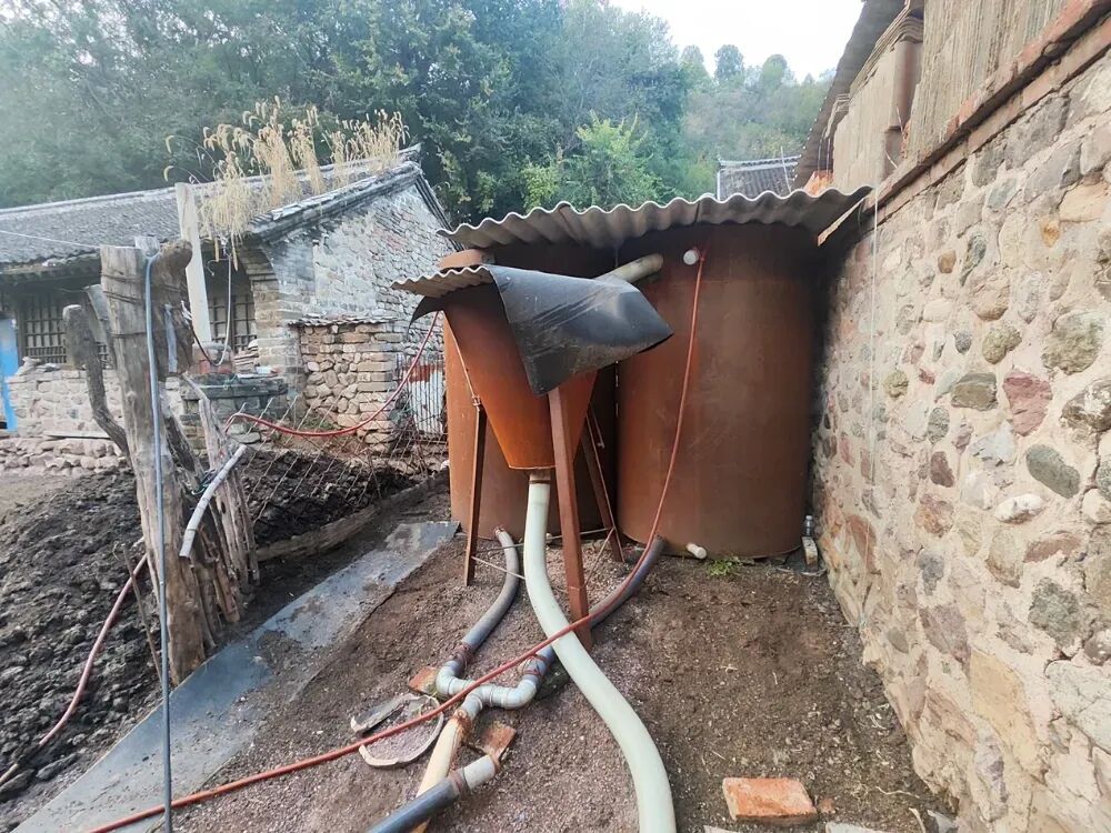 在清河沿村一户村民的院子里,新京报记者看到,两只铁桶并列放置,高约两米,每只直径约一米,铁桶上方和下方分别有一根进水管和一根排水管与之相连。