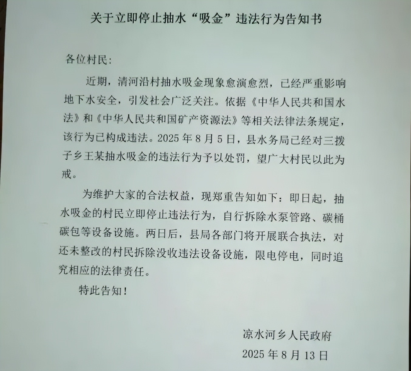 通知称,清河沿村“抽水吸金”现象愈演愈烈,已严重影响地下水安全,并提到县水务局此前已对三拨子乡王某“抽水吸金”的违法行为予以处罚,要求村民立即停止违法行为、拆除相关设备,县局各部门将开展联合执法,否则将被限电停电并追责。