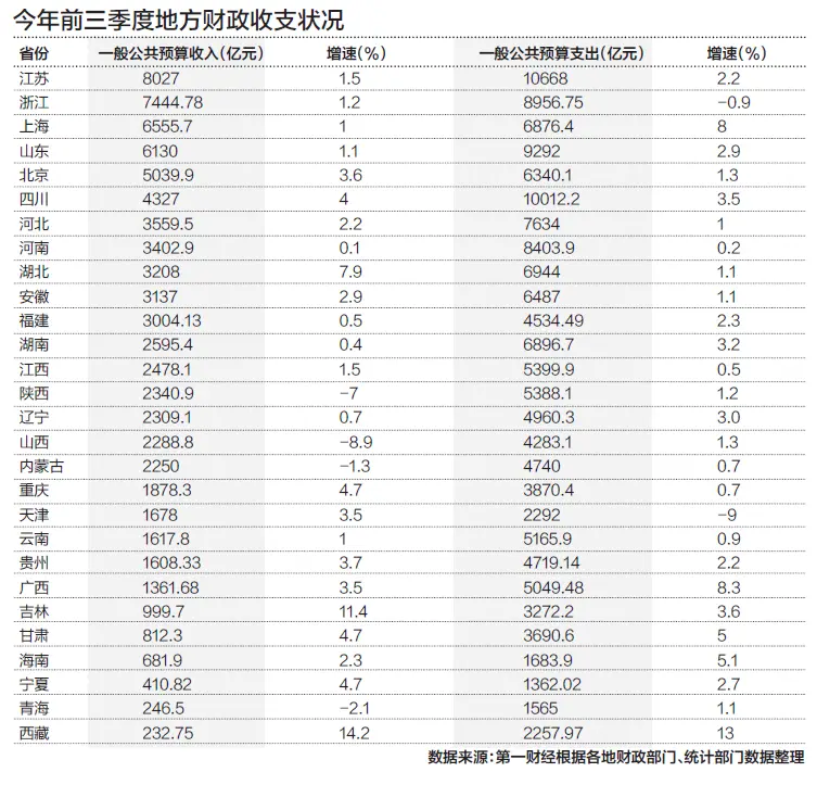 地方政府近期相继公开前三季度财政账本,总体来看地方财政收入保持小幅增长,较为平稳,而财政支出总体也保持小幅增长,支出普遍高出收入,以稳经济、保民生。