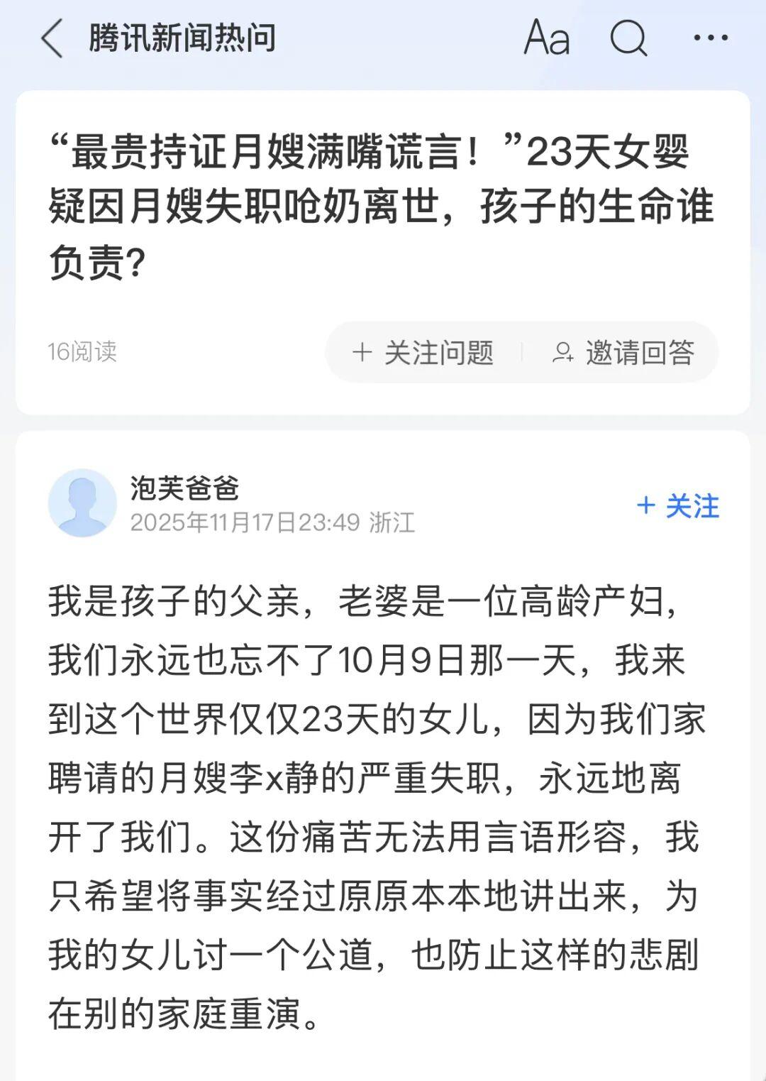 近日,杭州市的奉先生腾讯新闻热问上发声,称自己出生仅23天的女儿因为月嫂的严重失职不幸去世。奉先生认为,月嫂错误的喂奶方式、宝宝呛奶后未能及时处置甚至隐瞒呛奶情况,导致宝宝最终窒息死亡。