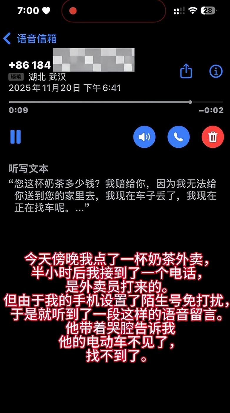该网友发布的视频显示,当天得知情况后,给该外卖员回电时,对方不停地道歉,“他说希望可以把奶茶的钱退给我,因为现在已经取餐了,我没有办法在商家申请退款,奶茶在他手上,但他没有车给我送来。我说奶茶你就留在手上喝,他说着说着就像一个小孩般哭起来了,听他的声音,感觉年龄也稍大,当时我的心里已经很不是滋味了。”