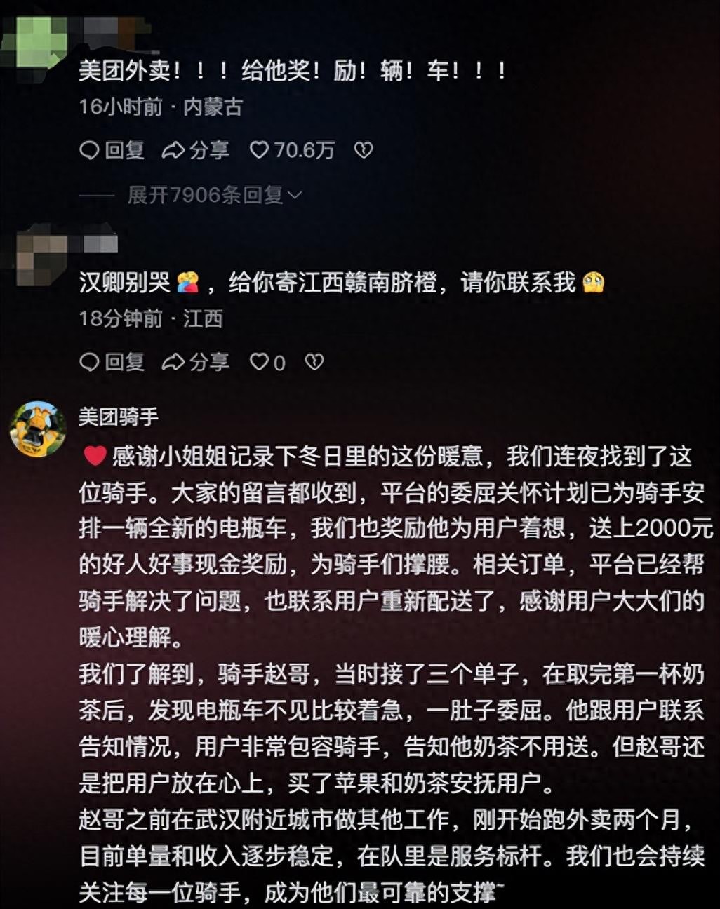 11月21日下午,“美团骑手”账号也在评论区回复称,“平台的委屈关怀计划已为骑手安排一辆全新的电瓶车,我们也奖励他为用户着想,送上2000元的好人好事现金奖励,为骑手们撑腰。”