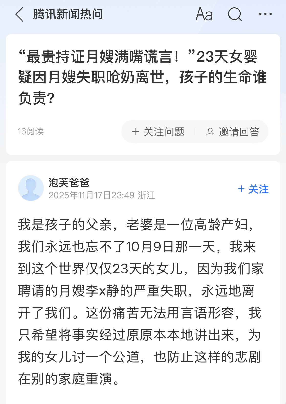 近日,杭州市的奉先生腾讯新闻热问上发声,称自己出生仅23天的女儿因为月嫂的严重失职不幸去世。奉先生认为,月嫂错误的喂奶方式、宝宝呛奶后未能及时处置甚至隐瞒呛奶情况,导致宝宝最终窒息死亡。 奉先生在腾讯新闻热问上说道,事情发生在10月9日凌晨,当晚月嫂和宝宝在一间房休息,1点46分左右宝宝醒了,奉先生先把奶冲好之后,1点54分左右拿进女儿的房间,把奶瓶放在床头柜上,让月嫂给宝宝喂奶。 奉先生在事后查看房间监控才知道接下来发生的事。1点54分,月嫂开始喂奶,她没有开房间灯,只是开一个微弱到监控都识别不出光线的小夜灯喂奶。喂了大概一分多钟,在1点56分,宝宝发出了第一声呛咳的声音,紧接着是第二声、第三声。然后,就开始发出非正常的、持续的哭声,那种声音就像喘不上气一样,与宝宝刚醒来时的哭声完全不一样。 宝宝的哭声整整持续了26秒。监控里月嫂还在说“来来来,再来哦”,直到1点58分,她才放下奶瓶。从开始喂奶到放下奶瓶,整个过程持续了4分多钟。放下奶瓶后,又过了一分钟,到1点59分才打开房间灯观察宝宝的情况。 奉先生还不知道监控记录下来的事情,他只是听到哭声进入了房间查看,月嫂跟他说“吃了一两口就不好好吃了”。奉先生问是不是呛到了,她回答:“呛到了?不是这样的啊。” 当时宝宝的哭声已经越来越不正常,接近2点钟,月嫂才把孩子趴放在她腿上拍后背。 2点03分左右,奉先生发现女儿口中有透明的、能拉丝的粘液流出来,月嫂却辩解宝宝在拉屎。此时,宝宝的哭声已经显得很没有力气了。奉先生的妻子王女士从自己的房间担心地赶来查看,月嫂见到又说“平时都是吃到最后拉的,今天提前拉了”,始终没有提“呛奶”两个字。 2点04分左右,宝宝开始出汗。2点06分,宝宝的手开始挣扎。2点07分,宝宝的嘴唇颜发紫了,王女士着急地问月嫂“这嘴唇颜色紫色正常吗?”,几乎都快哭出来,月嫂这才说“要不我们还是去医院吧”。 在出发去医院前,王女士急切地要求月嫂给孩子做海姆立克,海姆立克是每个月嫂都要掌握的,最初面试月嫂时奉先生夫妻俩也是慎重确认过,月嫂那时自信满满地说她接受过培训,但是这时她只是继续给宝宝拍背。奉先生拨打了120询问了急救办法,并转告了月嫂可以用两根指头按压胸部,然而家人看到的是,月嫂并没有做出规范的动作,只是胡乱地用手掌拍打宝宝的胸口。 奉先生开车带着宝宝、家人和月嫂去医院,太着急了中间还闯了几个红灯,本来要十几分钟的路程,六分钟在大约在2点26分就赶到了医院,作为唯一一个全程在场的人,月嫂向医生口述经过,宝宝被送去抢救,医院的诊断是宝宝呼吸心跳骤停和窒息。奉先生是在后来在医生的抢救记录上看到“呛咳半小时,发色发绀、呼吸减弱17分钟”,他这才意识到月嫂隐瞒了喂奶时发生的真实情况。