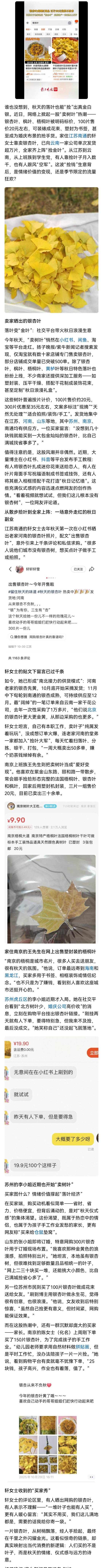 [盐都杂谈] 百片20元的银杏叶在网上卖“爆”了?江苏女子全家动员“捡金叶”,一个秋天卖出数万片
