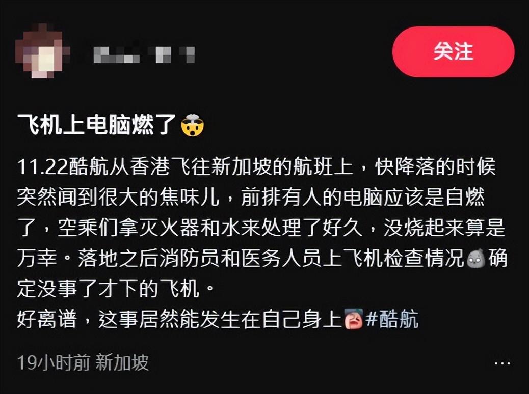 今日有网友爆料称,11月22日乘坐酷航香港至新加坡航班时,疑似有乘客手提电脑在机上自燃。现场视频显示,数名空乘人员迅速用垃圾袋处置烧焦的电脑残骸。注 同机乘客发布的照片可见机舱座椅旁留有明显烟熏痕迹,事发后航班已安全降落在新加坡樟宜机场。
