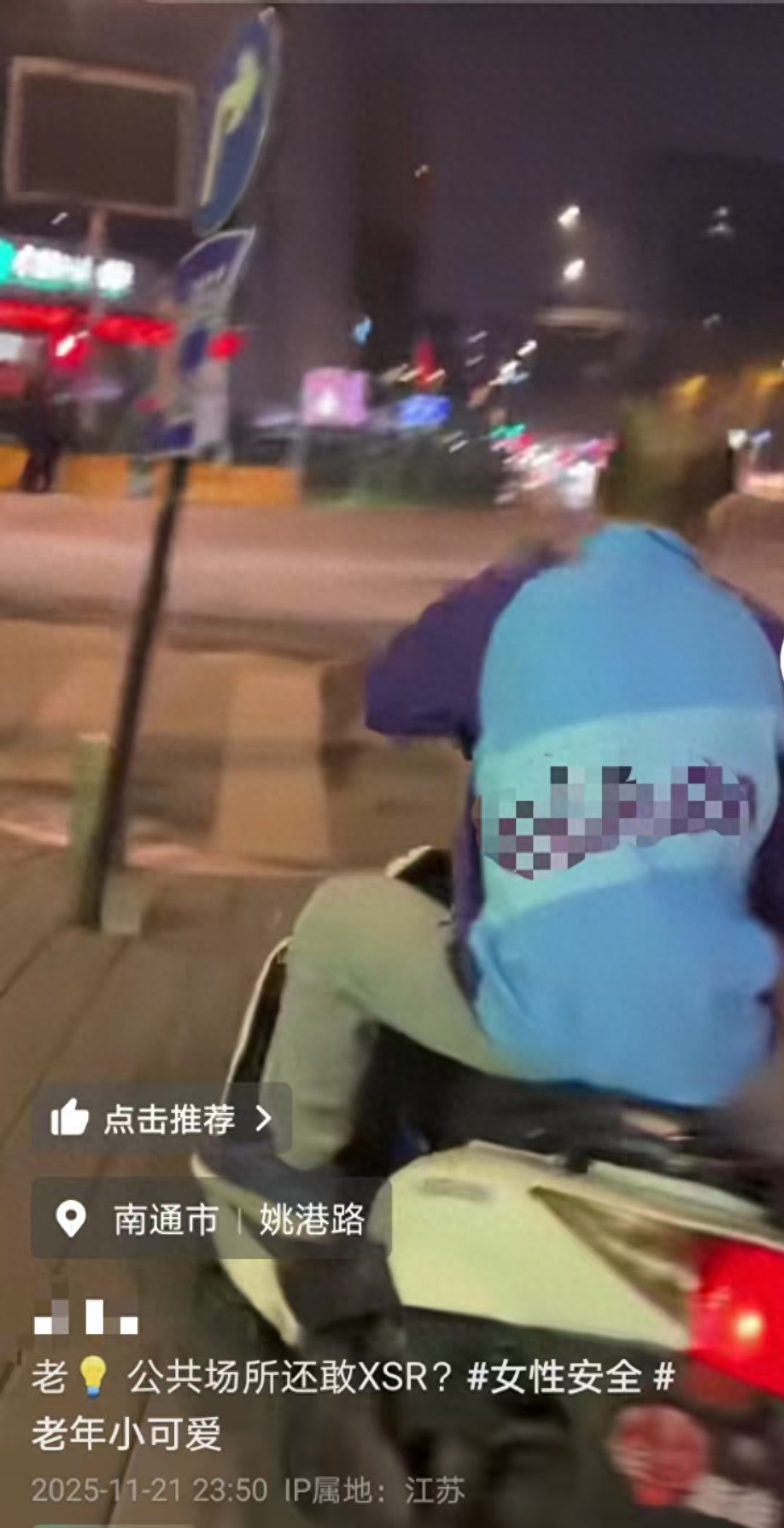 近日,江苏南通,网友反映被一男子在公共场所性骚扰,称其在一路上玩手机时,一陌生男子突然上前勾住她肩膀下摸至腰上方,还招呼她上他的电动车,要用手机拍时他就跑了。视频显示,该男子戴口罩骑电动车离去,女子说“你有病吧你。”    网友介绍,事发地在姚港路和青年路交叉口附近,她身边是跳广场舞的人群。该男子突然把车停在她身边做出该行为,“我问他干嘛 是干嘛的 意思天太冷一个小姑娘。”评论区有人表示,也被该男子在附近实施骚扰,质疑其是“惯犯”。   11月25日,该网友介绍,事后报了警,男子也被警方找到了,后续处理则不清楚。11月26日,潇湘晨报记者致电辖区派出所询问此事,工作人员表示,由于程序规定,相关情况不便透露。 随后,事发地所在的虹东社区工作人员告诉记者,他们已关注到此视频,但不认识该男子,也没有人向他们反映此事,具体详情可以咨询辖区派出所,“如果是主动来社区反映这种事,肯定会处理的。” 潇湘晨报记者於广强