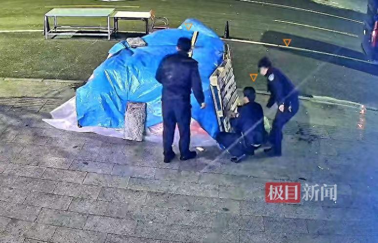 张先生提供的监控视频显示,27日凌晨风很大,还下着大雨,店门口货物的遮盖布几乎完全被吹开,仅剩一层透明薄膜遮挡。随后,一辆巡逻警车在店门口停下,一名巡警迅速下车,先通过店铺门口的电话联系商户,后与两名同事一起整理,过程中还有一名路人协助。他们一直寻找周围可用的重物压实篷布,直至完全固定后才离开。