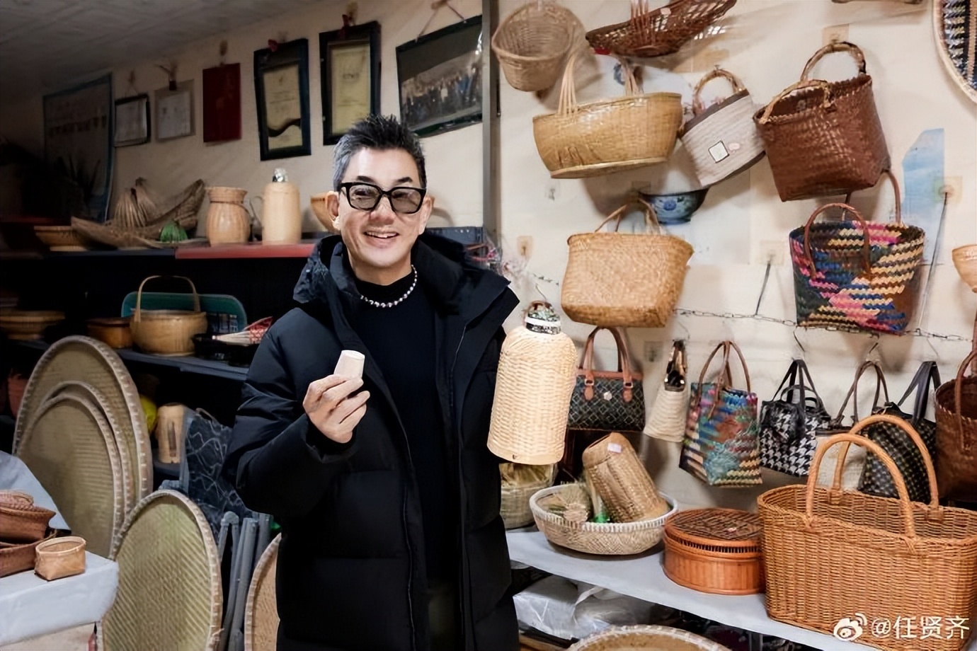 在郭建苗“百年竹器”店里,任贤齐举着竹编热水壶微笑的照片被他夹在货架旁边,显得格外显眼。