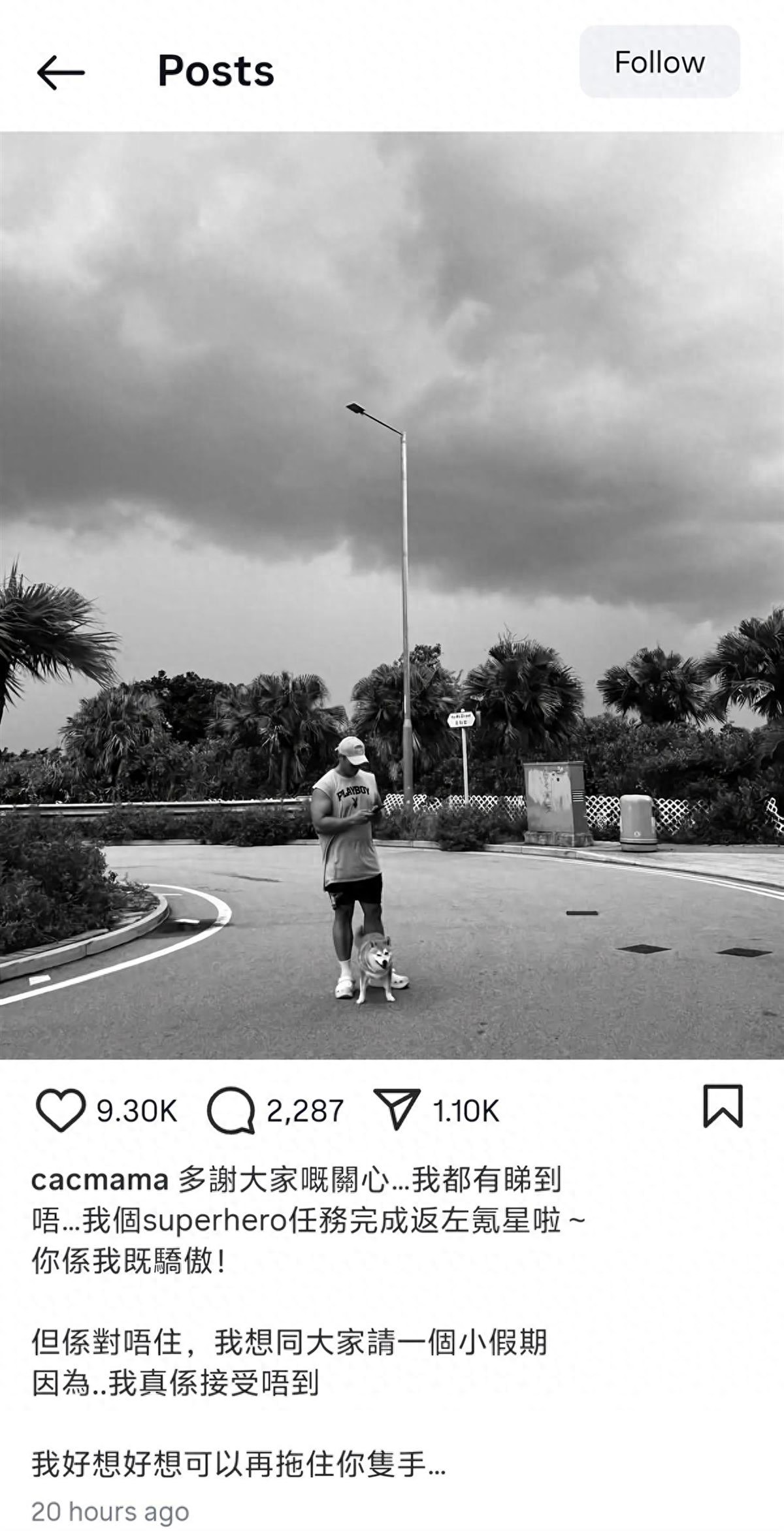 其女友Kiki难掩哀伤,在何伟豪社交平台账号上留言表示:“……你是我的骄傲。但是对不起,我想向大家请一个小假期,因为我真的无法接受。我好想好想可以再牵你的手。”