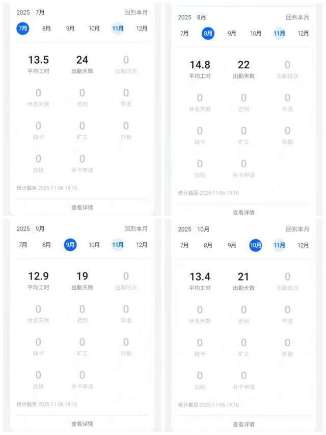 “我们怎么也想不到他会加班到这种程度。”孙女士痛心地说,她赶到无锡后曾登录小乐的钉钉账号,无意间发现,小乐2025年7-10月的日均工时均在13小时左右,8月甚至达到14.8小时。“我弟他们公司上午是9点上班,下午6点下班,但加班是常态。”孙女士说,小乐近期每天的下班时间多在深夜11点左右,平均每天加班四五个小时。
