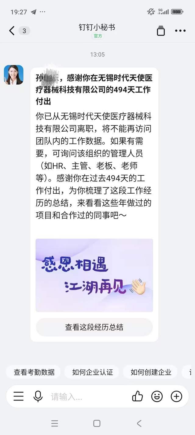 去世两小时后,工作账号显示离职状态孙女士说,无法看到监控资料弄清致伤原因,警方已初步排除上下班途中或出租屋内受伤,公司方面相关负责人依然认为小乐是自行摔伤。11月8日上午10时50分小乐去世,仅仅两小时后就发现小乐已与单位呈离职状态。孙女士提供的小乐工作账号11月8日13时05分的提示消息称:孙某乐,感谢你在无锡时代天使医疗器械科技有限公司的494天工作付出,你已从无锡时代天使医疗器械科技有限公司离职,将不能再访问团队内的工作数据……