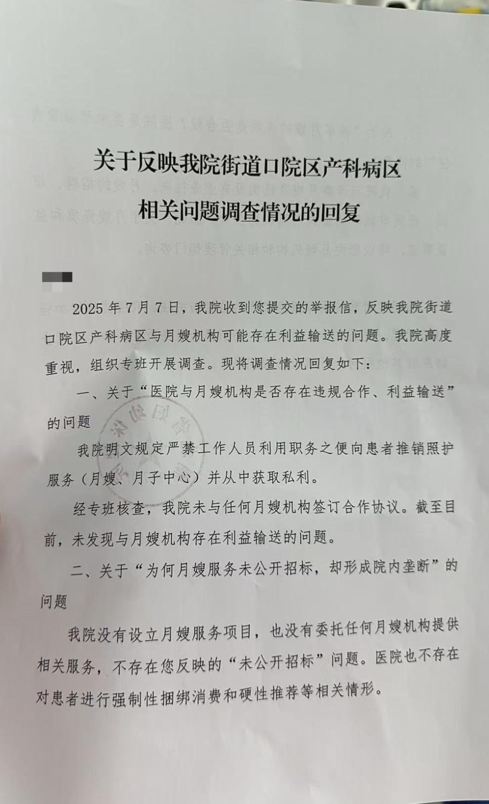 女婴母亲王女士曾于2025年7月就“湖北省妇幼保健院与三家月嫂中心疑似违规合作、存在利益输送”问题提交举报信。医院随后出具的调查回复显示,“院方没有设立月嫂服务项目,不存在对患者强制性捆绑消费和硬性推荐等情形;且院方与涉事月嫂及机构无业务往来,月嫂的招聘、培训、资质审核等由其所属机构负责。”