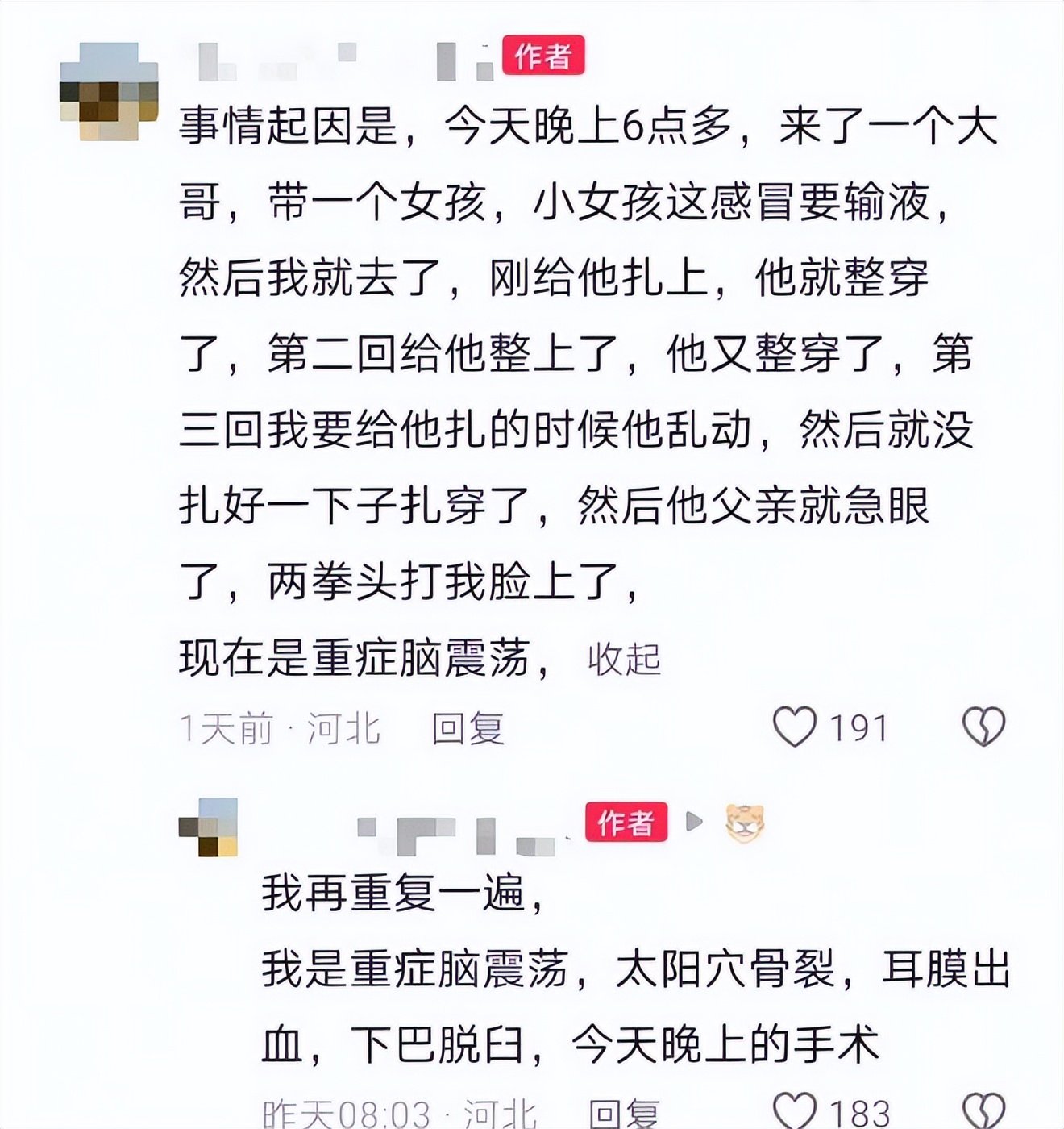 11月30日,该网友发布视频显示,其脸上有血迹。其介绍,“自己是重症脑震荡、太阳穴骨裂、耳膜出血、下巴脱臼,要做手术。”并已报警。其介绍,自己在秦皇岛市第一医院儿科上班。