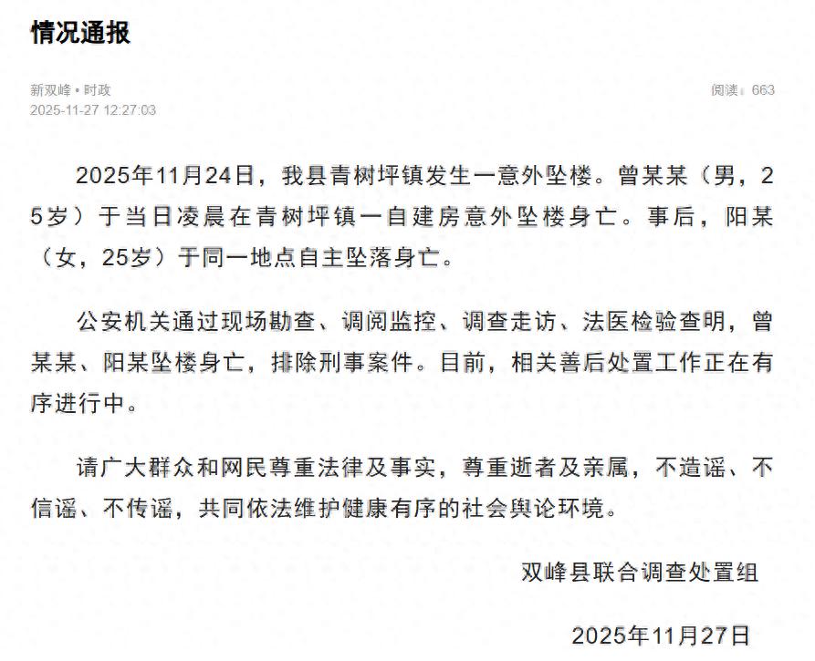 2025年11月24日,我县青树坪镇发生一意外坠楼。曾某某(男,25岁)于当日凌晨在青树坪镇一自建房意外坠楼身亡。事后,阳某(女,25岁)于同一地点自主坠落身亡。