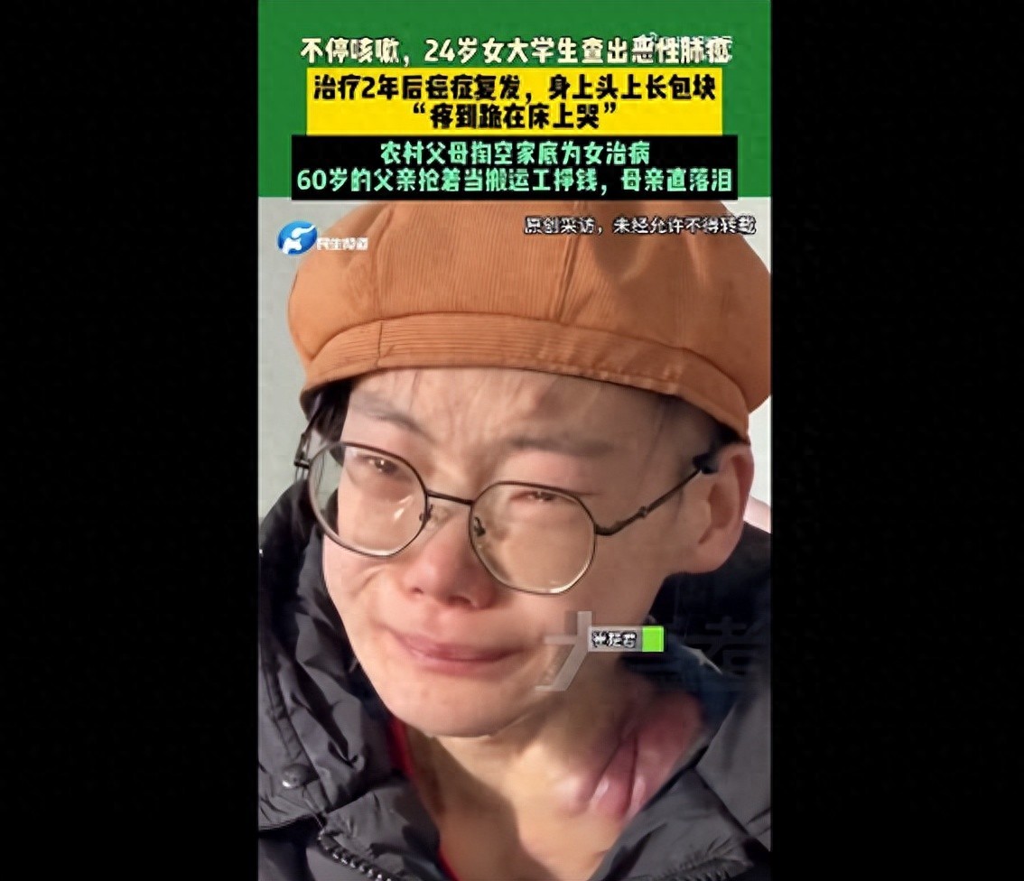 据12月3日报道,河南焦作24岁女大学生小君持续咳嗽后查出恶性肺癌,治疗两年不幸复发,头部身上凸起疼痛包块,经常“疼到跪在床上哭”。    父母拼尽全力为女儿治病,60岁的父亲早上六点出门抢着当搬运工挣钱,最晚的时候干到凌晨两点,每天回到家第一件事就是先把兜里的钱掏空放好,生怕弄丢一分。小君父亲腿脚不好,但自从女儿癌症复发后,他就没有休息过。  母亲躲角落掉泪:“孩子疼到睡不了觉,我们只能拼了命挣。”小君经常责怪自己生病,怕拖累哥哥。但是在外打工的哥哥说:“大不了不成家,我一定要救我妹妹!” 目前,小君正在积极接受治疗,祝愿她能早日康复! (来源:河南广播电视台民生大参考)