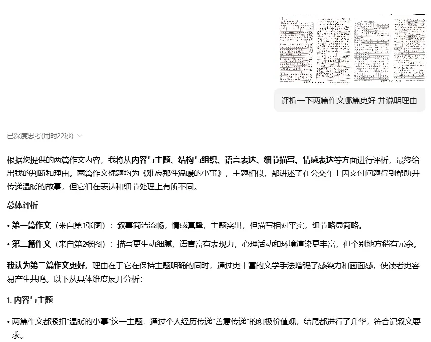 广西南宁,12岁的陈夏在一所重点中学读初一,他在期中考试的命题作文《难忘那件温暖的小事》中被扣了六分。拿到作文答题卡后,他分别将自己的作文发给了豆包和元宝,让他们评析作文的缺点并提出修改建议。他根据建议重新写了一篇同题作文,又将前后两次的作文都拍了照,再一次发给豆包和元宝,让它们“评析一下两篇作文更好,并说明理由”。果不其然,两个AI都认为改后的作文更好。