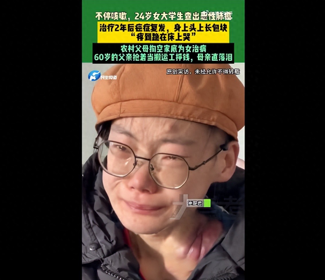 据12月3日报道,河南焦作24岁女大学生小君持续咳嗽后查出恶性肺癌,治疗两年不幸复发,头部身上凸起疼痛包块,经常“疼到跪在床上哭”。