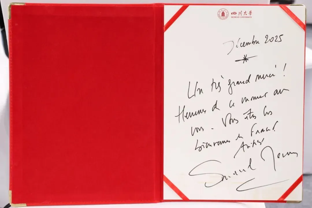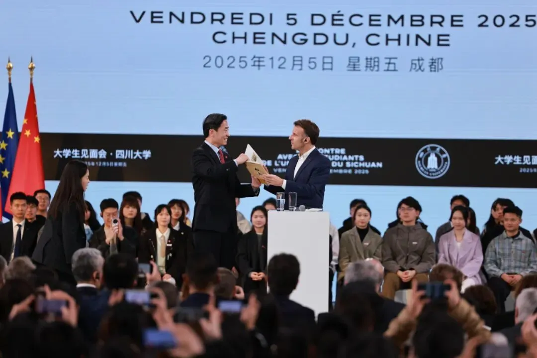 演讲结束后,校党委书记甘霖代表学校向马克龙赠送《四川大学博物馆藏品集萃》。丛书收录了始建于1914年的四川大学博物馆的代表性藏品,涵盖书画、瓷器、印章、货币、皮影、藏传佛教艺术等门类。这些文物生动展现了中国西南地区独特的历史与文化,彰显了中华优秀传统文化的底蕴与传承。