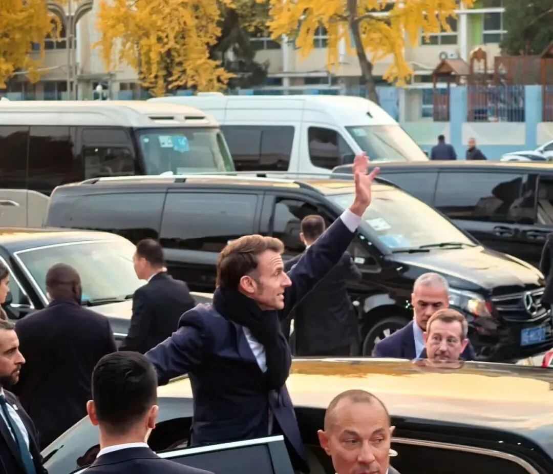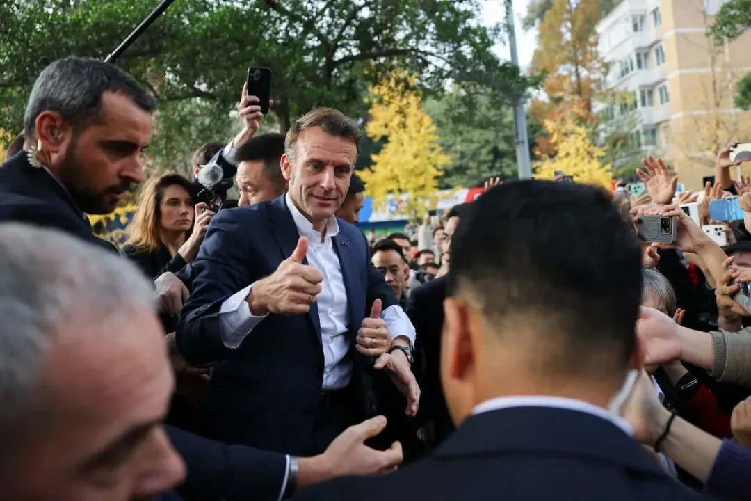 在上车离开前,马克龙再次快步走向人群,与大家挥手道别。