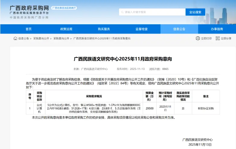 近年来,类似官方文件出错被质疑的事例并不鲜见。也是在本周,广西民族语文研究中心发布的一则采购意向公告,引发质疑。公告显示,该中心需采购5台华为台式计算机,预算金额为29500万元。5台电脑要3个亿?对于如此“天价”,研究中心工作人员表示,经确认是单位将“元”误标为“万元”,目前已在广西政府采购网修正公告。