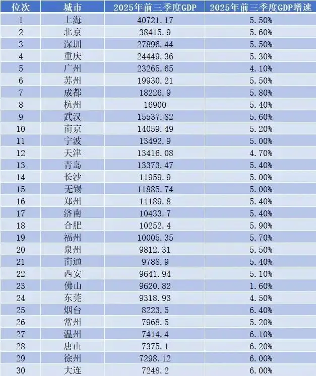 2024年GDP在3万亿之上的城市,就五个:四个一线城市+重庆。其中,上海最多5.39万亿,北京4.98万亿,深圳3.68万亿,重庆3.22万亿,广州3.1万亿。