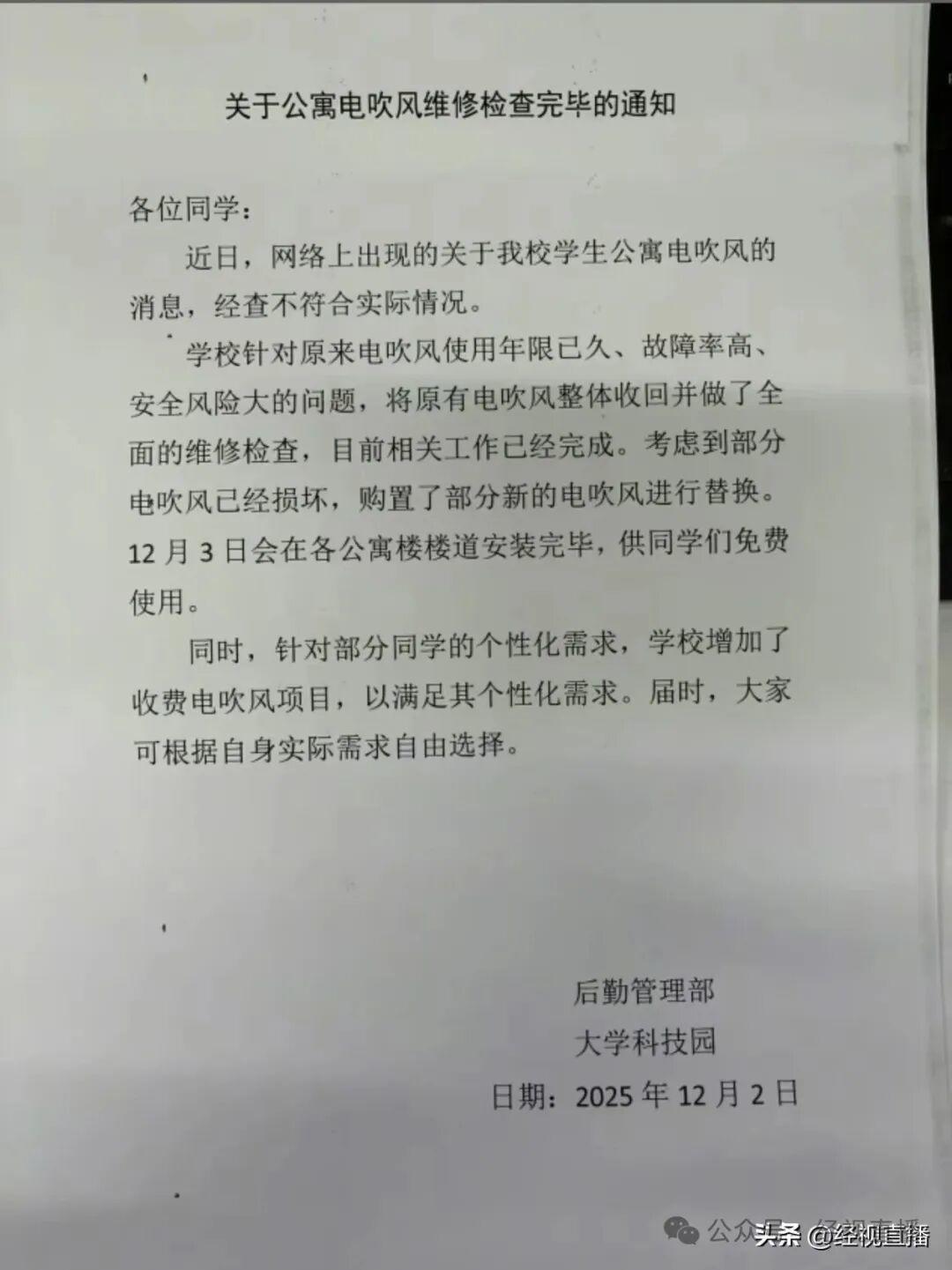 近日,有网友发帖反映,中北大学学生宿舍内增设收费吹风机,同时拆除了原本可供学生免费使用的吹风机。该网友晒出图片显示,该收费吹风机根据使用时长不同,收费标准分为0.5元、0.8元两档。这一消息引发不少网友热议。 12月5日,记者联系上一位中北大学在读的学生。该学生介绍,宿舍吹风机收费标准分为三分钟0.5元、五分钟0.8元两种。同时,该同学还提供了一张宿舍楼内张贴的《关于公寓电吹风维修检查完毕的通知》照片。这份由学校后勤管理部与大学科技园于12月2日发布的通知提到:学校针对原来电吹风使用年限已久,故障率高、安全风险大的问题,将原有电吹风整体回收做全面的维修检查,目前相关工作已经完成,替换了部分损坏的电吹风并重新安装,供免费使用。同时,针对部分学生的个性化需求,学校增加了收费电吹风项目。 同日,记者以学生家长身份就此事致电中北大学后勤管理部,工作人员表示,学校宿舍楼内原本配备有免费吹风机,目前免费的吹风机已经均在正常运行。该部门另一位工作人员进一步补充,当前学校每栋学生宿舍楼都同时配备了免费吹风机与收费吹风机,学生可根据自身需求自由选择。吹风机的投放数量会结合宿舍楼的实际情况灵活调整。“女生宿舍就安得比较多,有6个,有8个,男生宿舍最少也是两个。” 当被问及收费吹风机与免费吹风机的具体区别时,该工作人员表示,学生可自主选择使用免费机型,两种吹风机的差异并未过多说明。