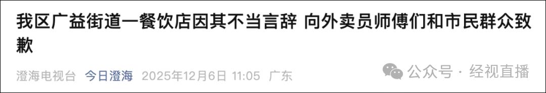 今天(12月6日)上午,微信公众号“今日澄海”发布“我区广益街道一餐饮店因其不当言辞 向外卖员师傅们和市民群众致歉”:
