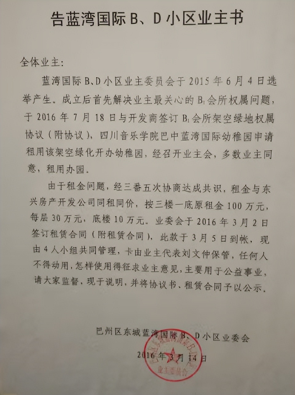 2016年3月14日,第一届业委会的一份《告小区业主书》介绍称,业委会成立后首先解决业主最关心的B1会所权属问题,于同年7月18日与开发商签订该会所架空绿地权属协议,四川音乐学院巴中蓝湾国际幼稚园申请租用该架空绿化开办幼稚园,经召开业主会,多数业主同意租用办园。