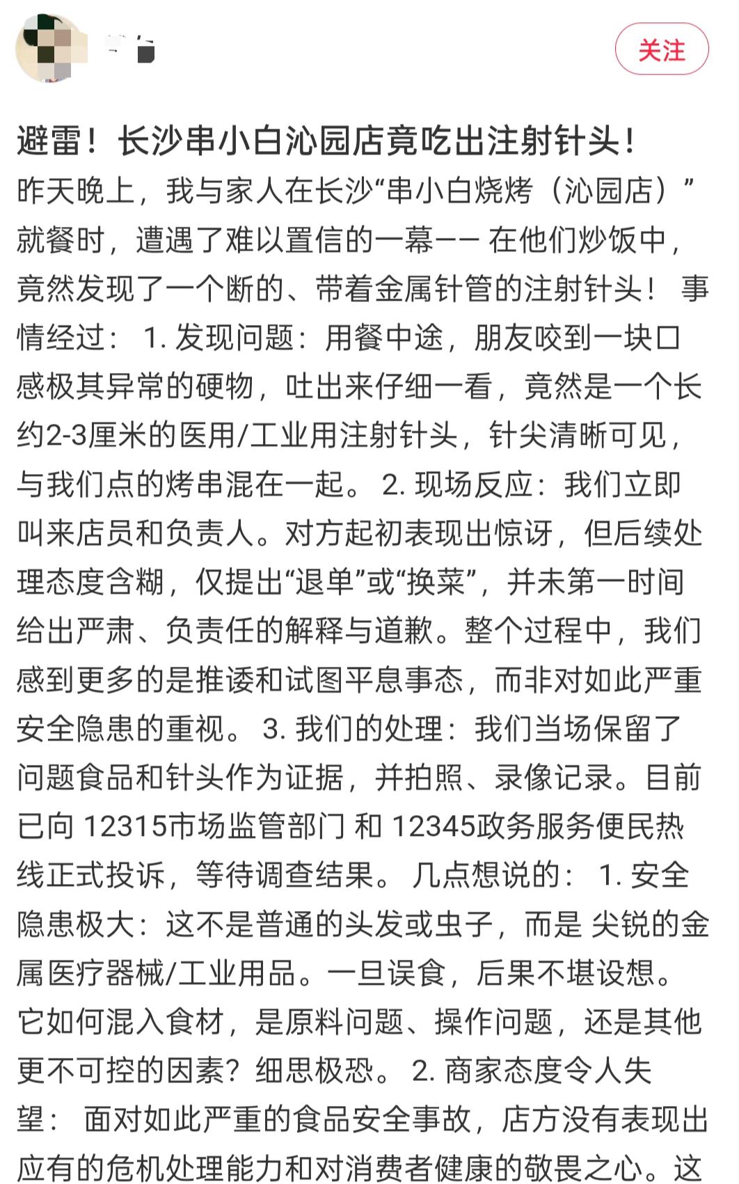 近日,有网友发帖称,自己在12月7日晚,于串小白(沁园店)就餐时,在点的炒饭中,发现一支断了的、带着金属针管的注射针头。这让他们感到后怕,认为安全隐患极大。
