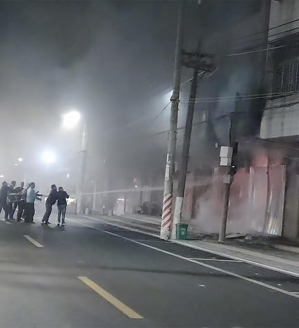 有现场视频显示,该建筑一楼率先起火,透过窗户可看见一楼五间店面都有明火,浓烟迅速蹿上楼,并伴随有噼里啪啦的声响。另一个视频显示,周边居民发现起火后,从对面第二间商铺拉来消防栓灭火,共有七八人举着消防水管试图扑灭一楼的明火。