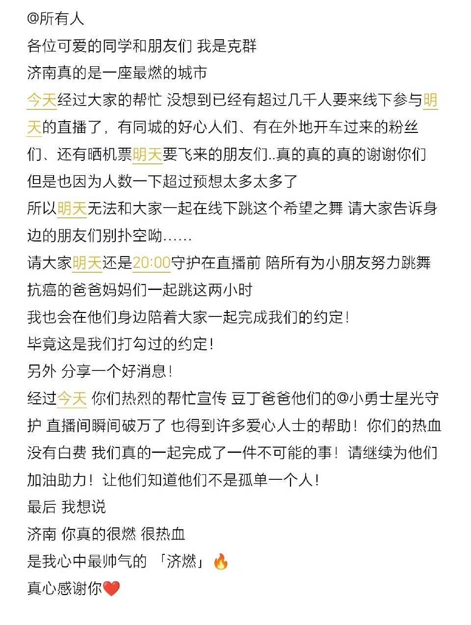 12月8日,在山东济南,吴克群分享了一段视频,他关注到有一群家长每天在寒风中跳舞,他在视频中解释这些家长们不是专业表演者,而是患罕见病儿童的父母,每一次重复的动作里,都是为孩子争取治疗机会,这些家长想通过直播跳舞的方式,请更多网友关注他们,以此来筹集医药费,他们从晚上七八点跳到凌晨1点,全力以赴地重复跳着“希望之舞”。吴克群在视频最后提出要学习这支“希望之舞”,号召更多人一起加入这个团播,完成这件不可能的事。  吴克群关注到一群患病儿童的家长在寒风中跳舞  吴克群关注到一群患病儿童的家长在寒风中跳舞 之后,吴克群工作室发文称:“经过大家的帮忙,已经有超过几千人要来线下参与明天的直播了,有同城的好心人们,有在外地开车过来的粉丝们,还有晒机票明天要飞来的朋友们……真的谢谢你们,但是也因为人数一下超过预想太多了,所以明天无法和大家一起在线下跳这个‘希望之舞’,请大家告诉身边的朋友们别扑空,也请大家明天还是20:00守护在直播前,陪所有为小朋友努力跳舞抗癌的爸爸妈妈们一起跳这两小时,我也会在他们身边,陪着大家一起完成我们的约定!毕竟这是我们打钩过的约定。”  吴克群工作室发文 12月9日,晚上8点25分许,吴克群如约和这些家长进行短视频直播连线,他表示因为报名参加此次活动人太多,并且场地有限,因此只能和各位家长在线上一起跳“希望之舞”,吴克群呼吁更多的人关注到这些患罕见病儿童的父母,为他们助力,让这些家长知道他们并不孤单。“我很开心能和你们一起跳舞,这支舞蹈我已经学了两天时间,现在我想陪着你们一起把这支舞跳好,给患病的孩子更多的希望。”吴克群对家长说道。  吴克群如约和患有罕见病儿童的家长一起直播连线,跳“希望之舞” 之后,吴克群陪着这些家长一起跳起“希望之舞”,直播间观看人数很快达到4万余人。在晚上9点37分,直播快要结束的时候,吴克群再次对所有观看直播的网友表示了感谢,并称希望我们都能够守护好身边最珍贵的人。 来源:极目新闻