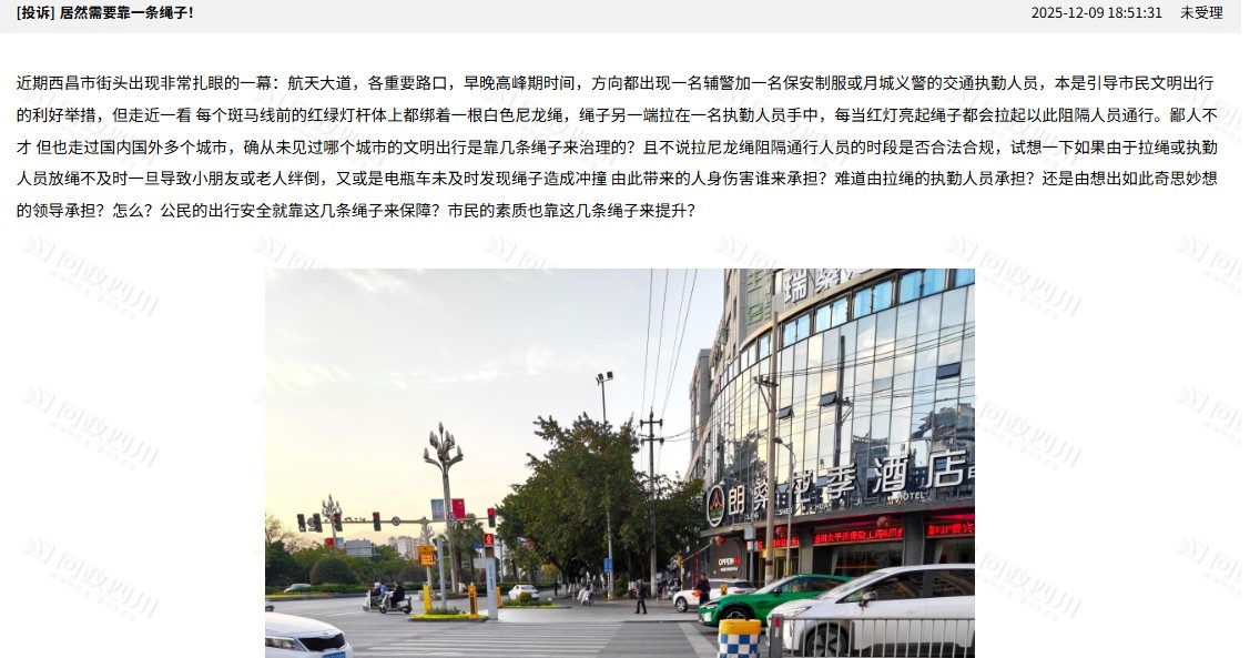 12月9日,网友发视频反映,四川西昌市区航天大道多个路口近期出现非常扎眼一幕:路边杆子上绑了一条绳子,红灯亮时,执勤人员就拉起绳子阻断通行,绿灯时放下。其认为此举不妥,存在可能绊倒行人、电动车冲撞等安全隐患。   该网友介绍,执勤人员是“一名辅警加保安制服或月城义警”。12月10日,潇湘晨报致电西昌交警大队,工作人员表示,暂不清楚此事,会将情况进行反馈。 随后,月城义警工作人员告诉记者,经了解,视频里的执勤人员不是他们义警,而是保安公司的保安,“这两天交警请了几个保安公司的保安,来一起维护交通秩序。”会将情况跟交警反馈一下。  公开资料显示,月城义警是当地的非营利性社会组织,由西昌市公安局作为业务主管,协助公安机关开展治安巡逻等工作。 潇湘晨报记者於广强