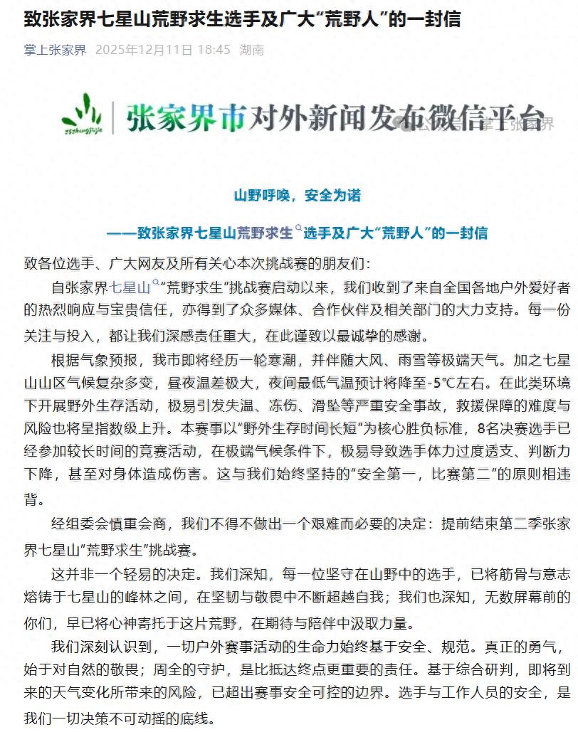 12月11日晚上,张家界七星山“荒野求生”挑战赛组委会突然发布《致张家界七星山荒野求生选手及广大“荒野人”的一封信》,信中称根据气象预报,张家界市即将经历一轮寒潮,并伴随大风、雨雪等极端天气。加之七星山山区气候复杂多变,昼夜温差极大,夜间最低气温预计将降至-5℃左右。在此类环境下开展野外生存活动,极易引发失温、冻伤、滑坠等严重安全事故,救援保障的难度与风险也将呈指数级上升。本赛事以“野外生存时间长短”为核心胜负标准,8名决赛选手已经参加较长时间的竞赛活动,在极端气候条件下,极易导致选手体力过度透支、判断力下降,甚至对身体造成伤害。经组委会慎重会商,决定提前结束第二季张家界七星山“荒野求生”挑战赛。