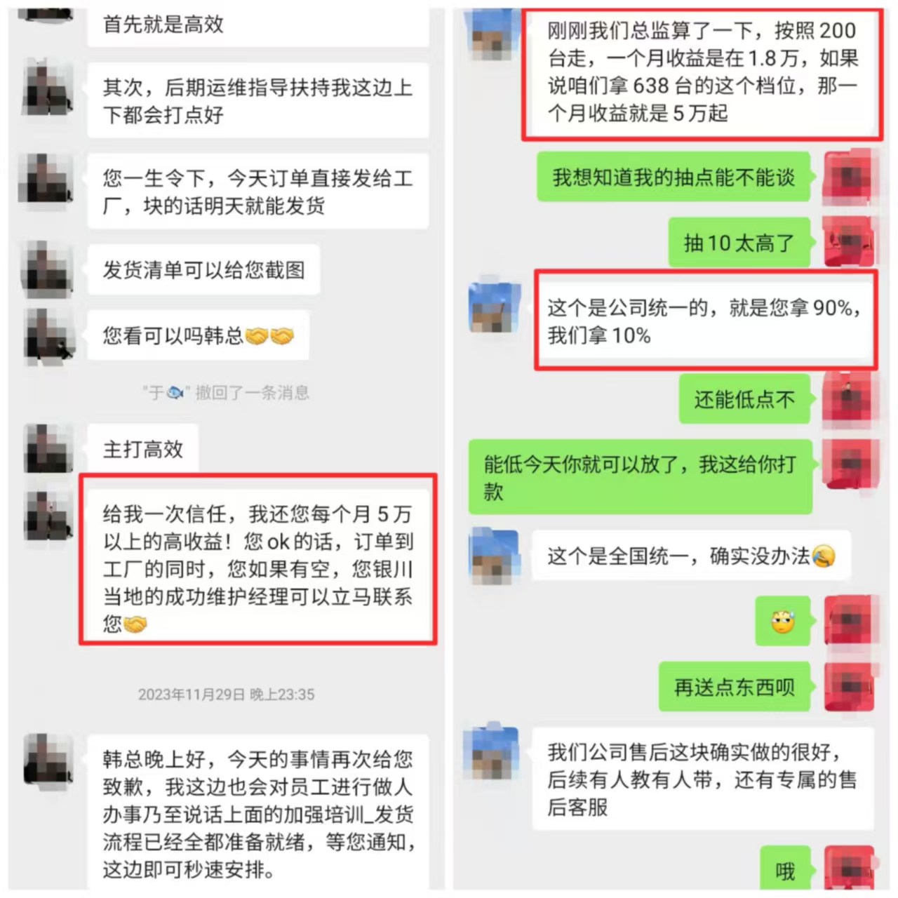 与工作人员聊天记录显示 “给商家的分成是虚假的” 有关韩先生反映的情况,深圳街电科技有限公司方面作何回应? 日前,华商报大风新闻记者联系韩先生提供的多名该公司工作人员,但不是离职就是电话处于无法接通状态。记者辗转联系到一位区域负责人,对方表示会向市场部同事反馈,由市场部回复记者,但记者始终未接到该公司回复。随后,记者联系到此前负责韩女士合作业务的一名前街电员工,其表示还记得相关合同事宜以及当时韩女士与街电招商部门签的协议,但对双方合作情况和分成事宜并不了解。 韩先生向记者提供了多张合作谈判前后与街电相关工作人员的聊天记录截图,记录了街电公司工作人员承诺韩先生分成90%利润,638台的投资档位可达到每月至少5万的收益,且6到8个月回本,“做得最差可能半年左右回本”;在韩先生发现街电铺设设备时又承诺给商户90%左右的利润分成后,对方则明确表示“给商家的分成是虚假的”。 当事人反映街电公司虚假宣传 市监部门已立案,正调查处理 据韩先生介绍,2024年5月他与街电方面交涉无果后,就向深圳市南山区市场监管局反映街电公司虚假宣传、骗代理商投资的情况,“我们向他们提供了充足的证据,他们最终立案了。”韩先生提供的立案告知书显示:经核查,该举报符合立案条件,我局决定立案。“过去一年多了,也没有结果。”韩先生说,他三个月前曾专门到深圳询问此事,该局一名负责人曾承诺两个月给结果,但至今已过去三个月,仍无音讯。 日前,华商报大风新闻记者联系到深圳市市场监督管理局南山监管局,一名工作人员表示,当事人今年还曾提供大量证据材料,所以仍在调查处理中。 华商报大风新闻记者 杨德合 编辑 赵瑞利