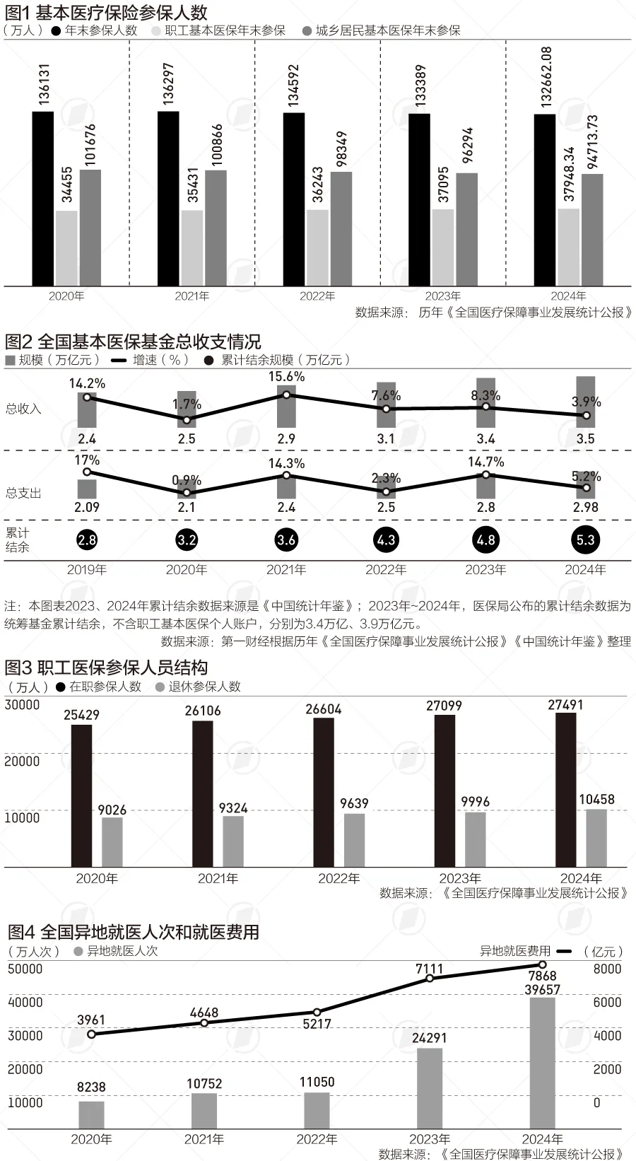 截至2024年底,全国基本医疗保险(下称“基本医保”)参保132662.08万人,2024年基本医保(含生育保险)基金总收入34913.37亿元,基金总支出29764.03亿元;统筹基金当期结存4639.17亿元,累计结存38628.52亿元。