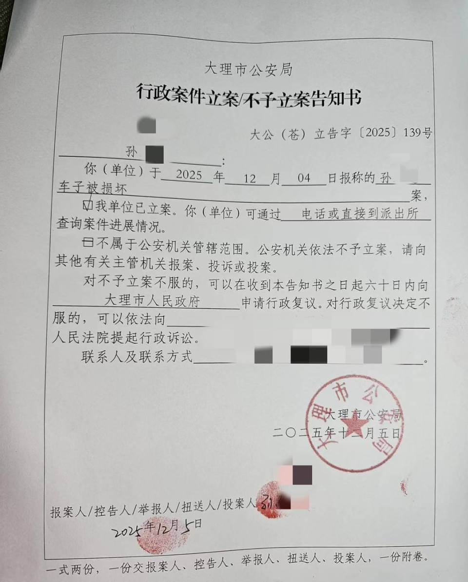 近日,有云南网友在社交平台发帖反映,在大理一租车公司租车后,半夜被人恶意划车,租车公司为此向该网友索赔。警方调取监控后,发现划车男子竟是该租车行员工。 12月18日,记者联系上发帖人王先生。王先生介绍,他目前在云南大理旅居,11月29日,和好友孙先生通过线上平台,在当地一家名为多福租车的公司,合租了一台新能源轿车,租金为30元/天。“当晚我们把车停在住所的路边上,还不知道车被人恶意划了。第二天下午3点多去租车公司还车,验车的工作人员说车辆右后方保险杠漆面损坏,要我们赔偿。”  车辆被划伤的部位 王先生表示,根据租车协议,车辆租赁期间产生的损坏或经济损失,应当由承租人承担。“依据赔偿标准,车身漆面损伤要赔偿1000元,我们给租车公司求情,最终赔600元。”  当事人向车行赔偿600元车损费用 回到住所后,孙先生发现隔壁工厂装有监控。12月4日,孙先生向苍山派出所报警,警方调取了工厂的监控视频,刚好完整拍下了当晚车辆被划的经过。记者在监控视频中看到,11月29日晚23时48分,一名戴着帽子和口罩的男子,来到小车旁边。先在车头部位确认了车牌,随后到车身的右后方蹲下,划伤车辆,全程约4分钟时间。12月5日,大理市公安局出具行政案件立案告知书,对此事进行立案调查。  监控录像截图 “恶意划车的员工,租车时我们就看到过,第二天还车时,验车的也是他,身上穿的衣服都没变,跟监控里的一模一样。”王先生说,他们住所距离租车公司接近4公里,车行对外租赁的汽车上装有GPS定位,“这名员工就是通过定位找到车子,半夜恶意划车,然后和车行自导自演一出戏,找客户索赔。我在网上发帖,一方面是提醒大家当心这种陷阱,另一方面是呼吁和我们有类似经历的朋友,站出来指证这家租车行。” 孙先生告诉记者,近日案件承办民警告诉他,划车的员工已于12月11日,被公安机关处以12天行政拘留,并罚款800元。“今天中午租车行负责人联系我,退还此前600元赔偿,但要求我们不得再以任何理由,通过任何渠道追究责任,我认为这样的附加条件并不合理,暂时没有收下归还的钱。”  警方立案告知书 记者联系了苍山派出所,接线民警表示并非案件承办人员,具体情况不清楚。此外,记者还联系了多福租车的负责人,负责人称划车男子在租车行兼职代驾,并证实目前已被行拘。公司是否会对该员工进行处理?“等公安机关处理完以后,该工作的还是要工作。我们有需要跑代驾什么的也会叫他,这种很正常”。男子划车行为是个人行为还是有公司授意?负责人回应是其个人行为。 来源:封面新闻