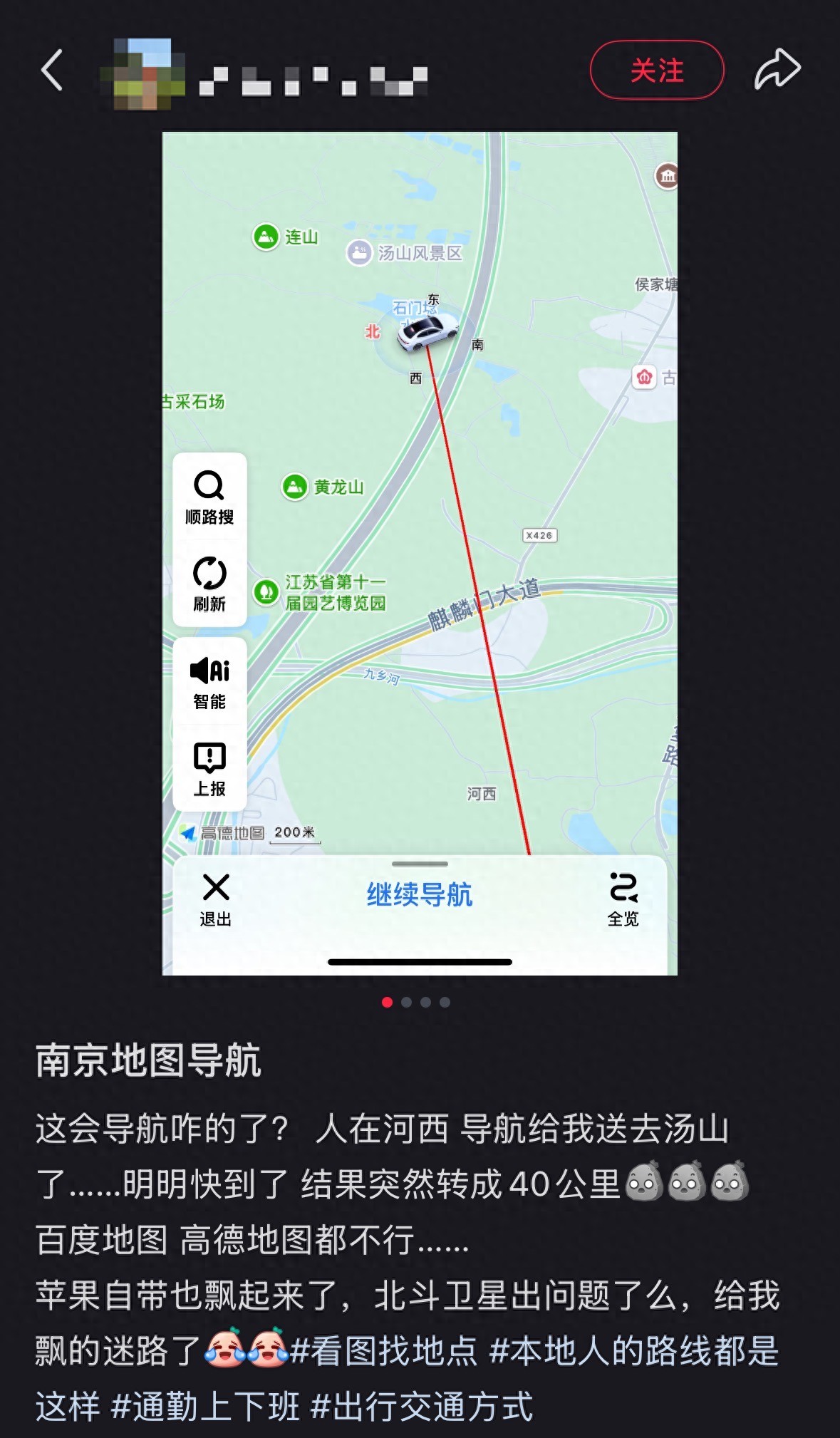 12月17日傍晚,多名南京网友发帖称,多个常用的导航软件出现定位不准、导航路线出错等问题。有网友反映,“导航崩溃了,一会显示在秦淮,一会显示在鼓楼。”也有网友表示,“人在河西,导航给我送去汤山了,明明快到了,结果突然转成40km,百度地图、高德地图都不行,苹果自带的也飘了起来。”另有网友反映,“人在江心洲家里,已经跑玄武湖里面去了。”     网友发帖截图 另据扬子晚报,有网友反映多个导航软件突发异常,导航界面持续显示“行驶在无数据道路上。”外卖骑手也纷纷反映,多个外卖平台内置导航出现问题,“看不见导航”或导致外卖配送延时。另有网友反映,部分共享单车也出现定位错误。 18日,潇湘晨报记者就此事致电南京12345便民服务热线,接线人员表示将立刻去核实该情况,会有职能部门进行回复,截至发稿记者未获回复。 百度地图客服表示,已记录该情况反馈给相关工作人员。记者同时将情况反馈至高德地图app,反馈显示“您上报的问题已经告诉定位工程师。” 潇湘晨报记者朱天翔 武华康